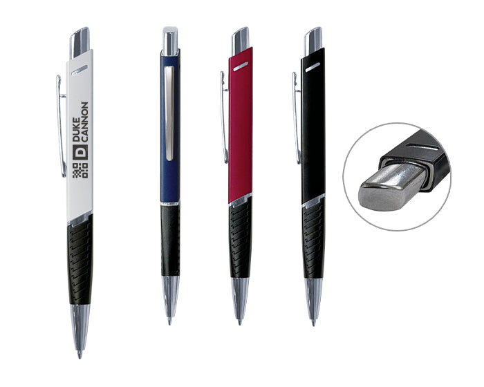 bolígrafo de aluminio con forma cuadrada, con excelente área para personalizar. cuenta con punta, clip, aro central y botón en cromo, grip negro con textura. tinta alemana negra. mecanismo de click.
