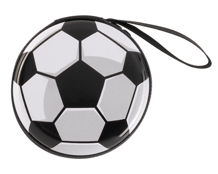 estuche monedero en forma de balón de soccer, cuenta con cierre lateral doble y jareta.