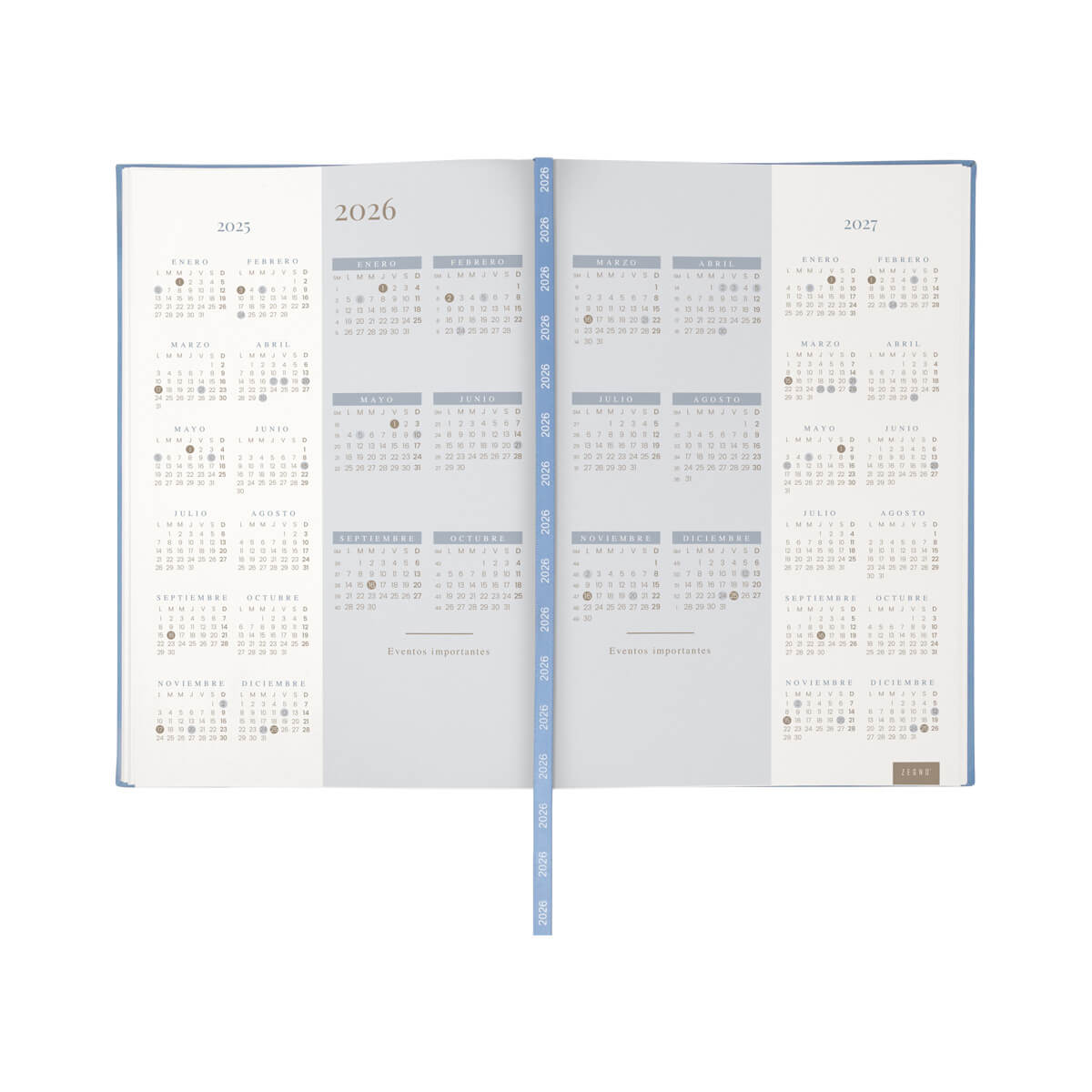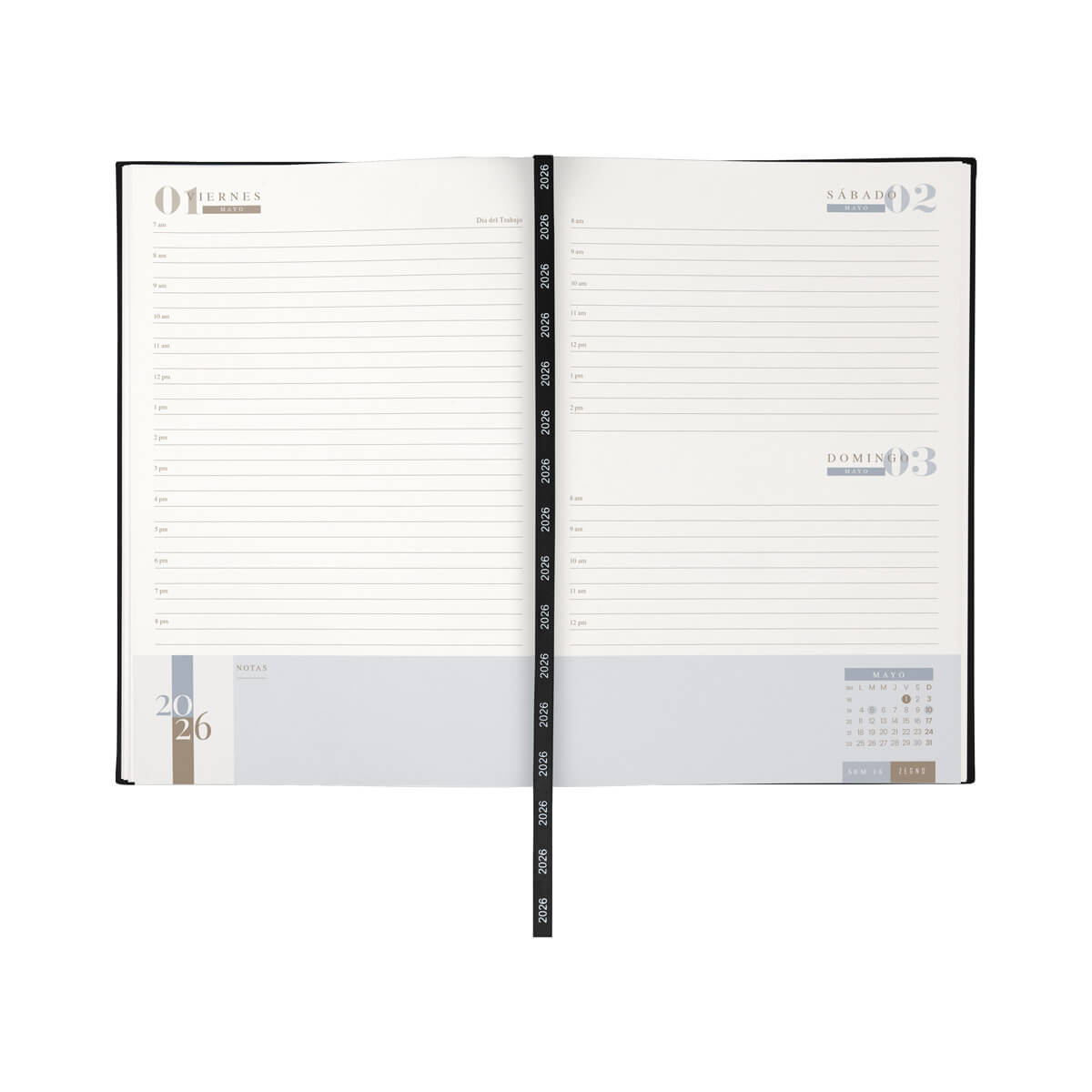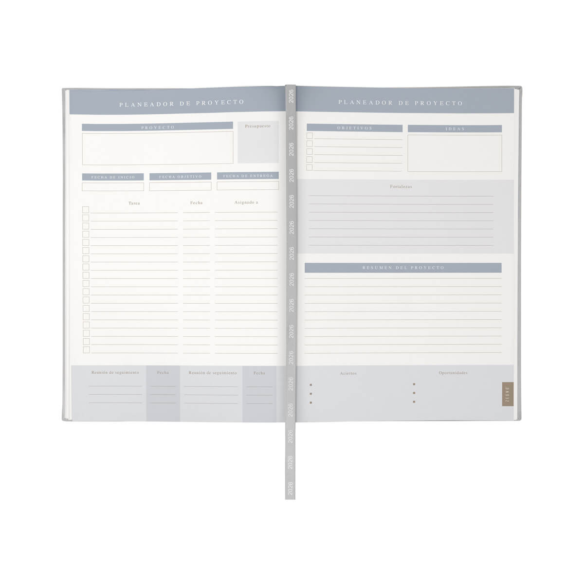 agenda diaria con 186 hojas. contiene datos personales, calendarios 2025-2026-2027, planeador 2026, presupuesto de gastos, seguimiento de nuevos hábitos, organizador de tareas, planeador de proyectos y días festivos. incluye caja individual.