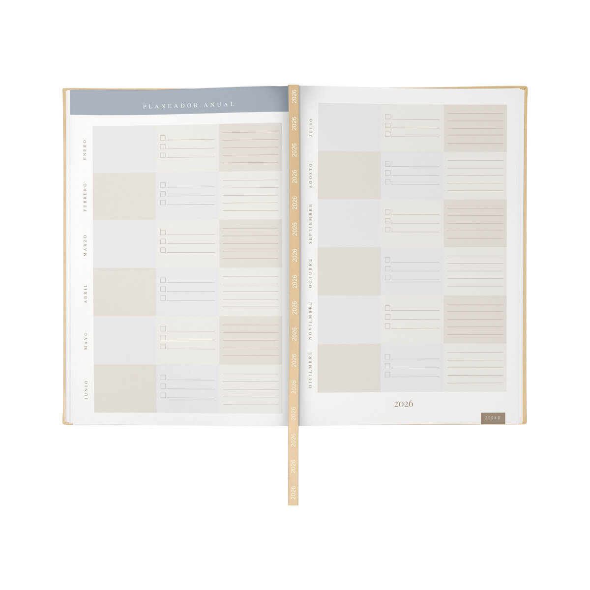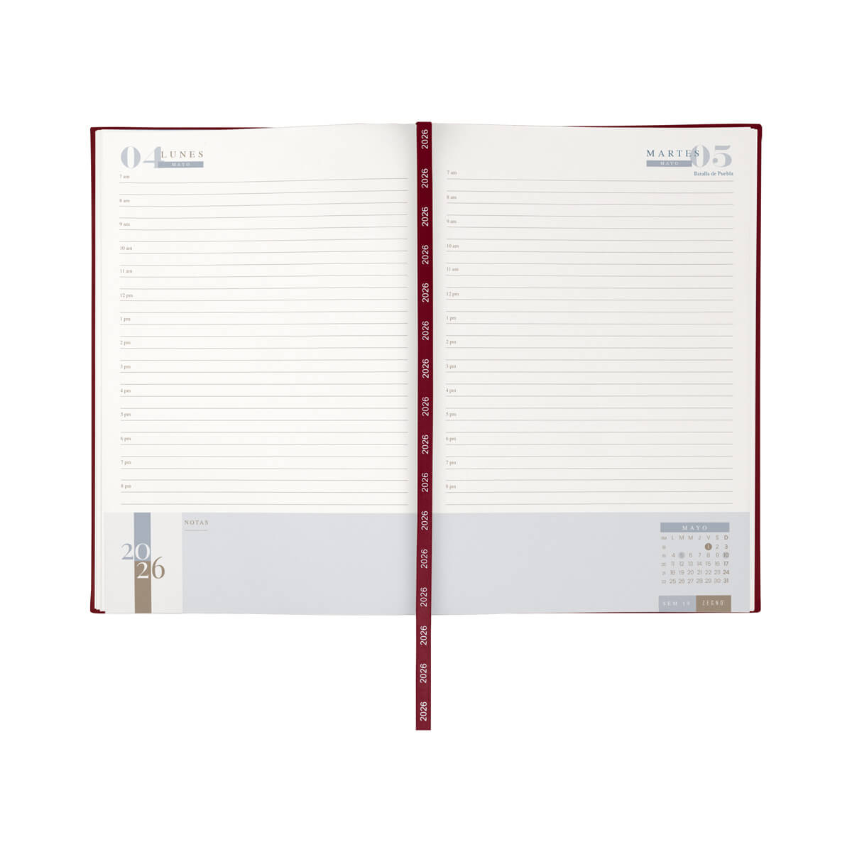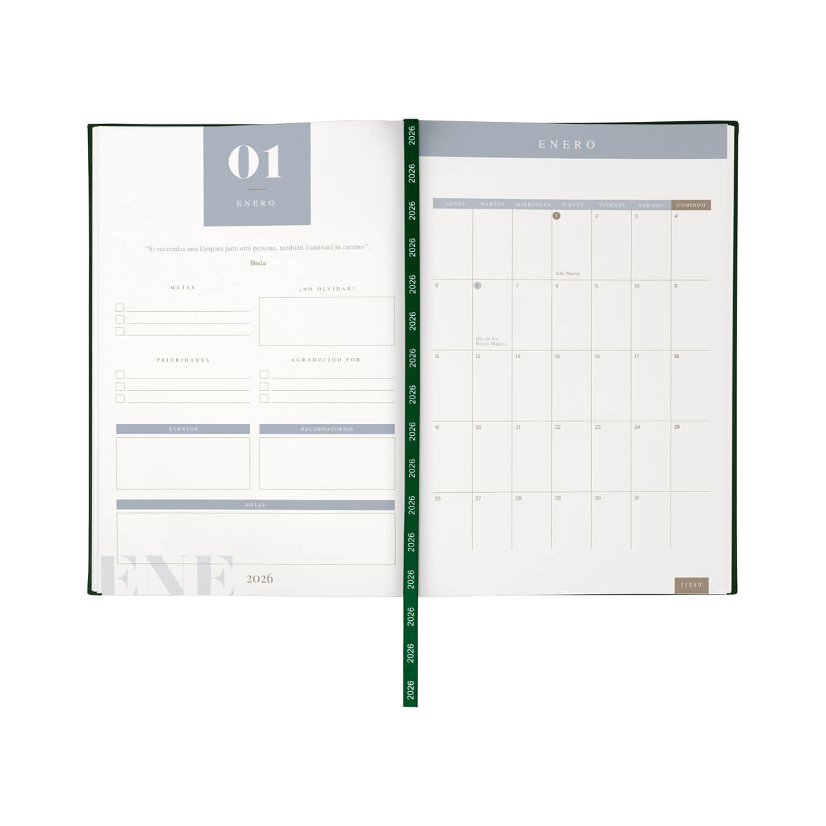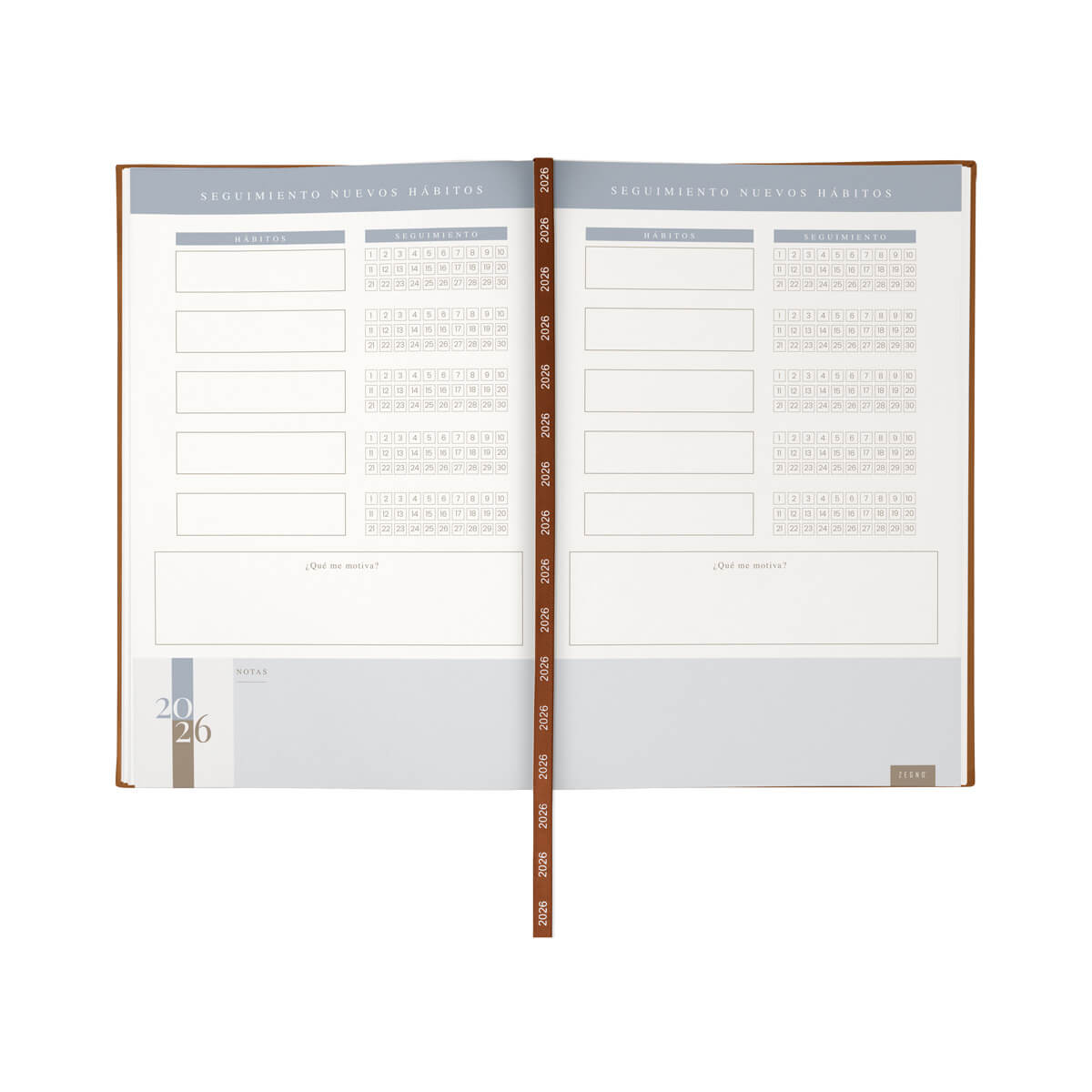 agenda diaria con 186 hojas. contiene datos personales, calendarios 2025-2026-2027, planeador 2026, presupuesto de gastos, seguimiento de nuevos hábitos, organizador de tareas, planeador de proyectos y días festivos. incluye caja individual.
