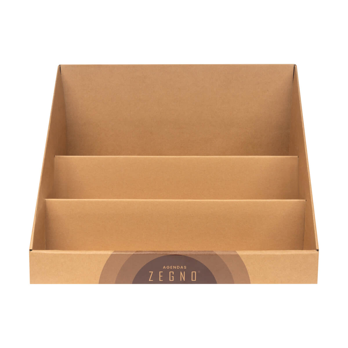 exhibidor de cartón, ideal para mostrar una amplia variedad de agendas. incluye múltiples modelos y colores organizados por tipo y tamaño, lo que facilita la visualización y selección del producto. su estructura práctica permite colocarlo sobre mostradores o mesas para una presentación atractiva en punto de venta. personalizado con diseño zegno en todas las caras, aporta un toque profesional y ordenado a cualquier exhibición.