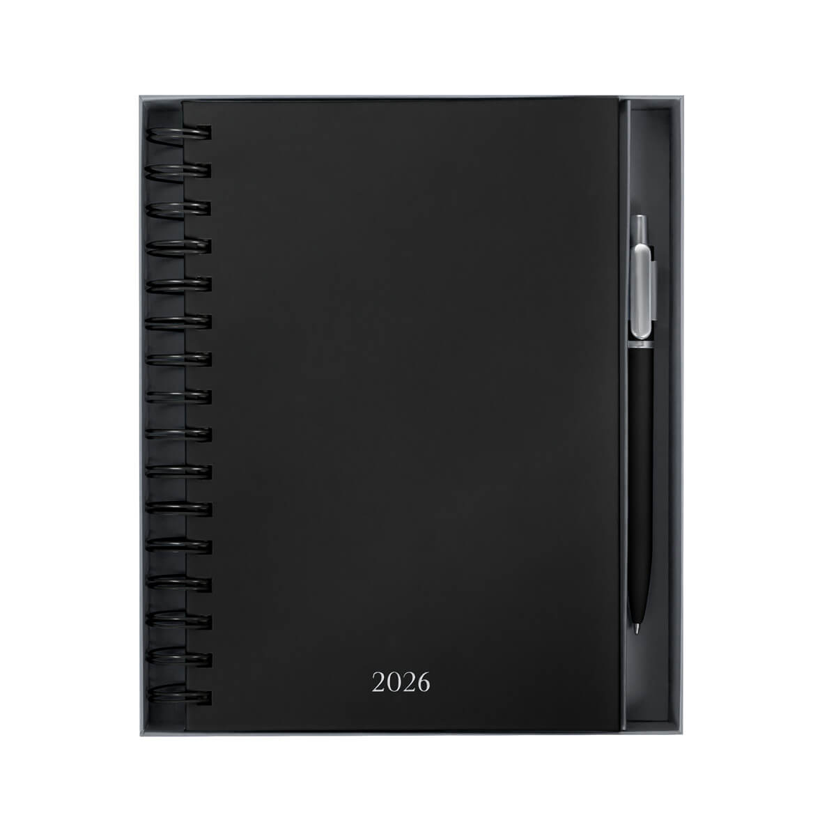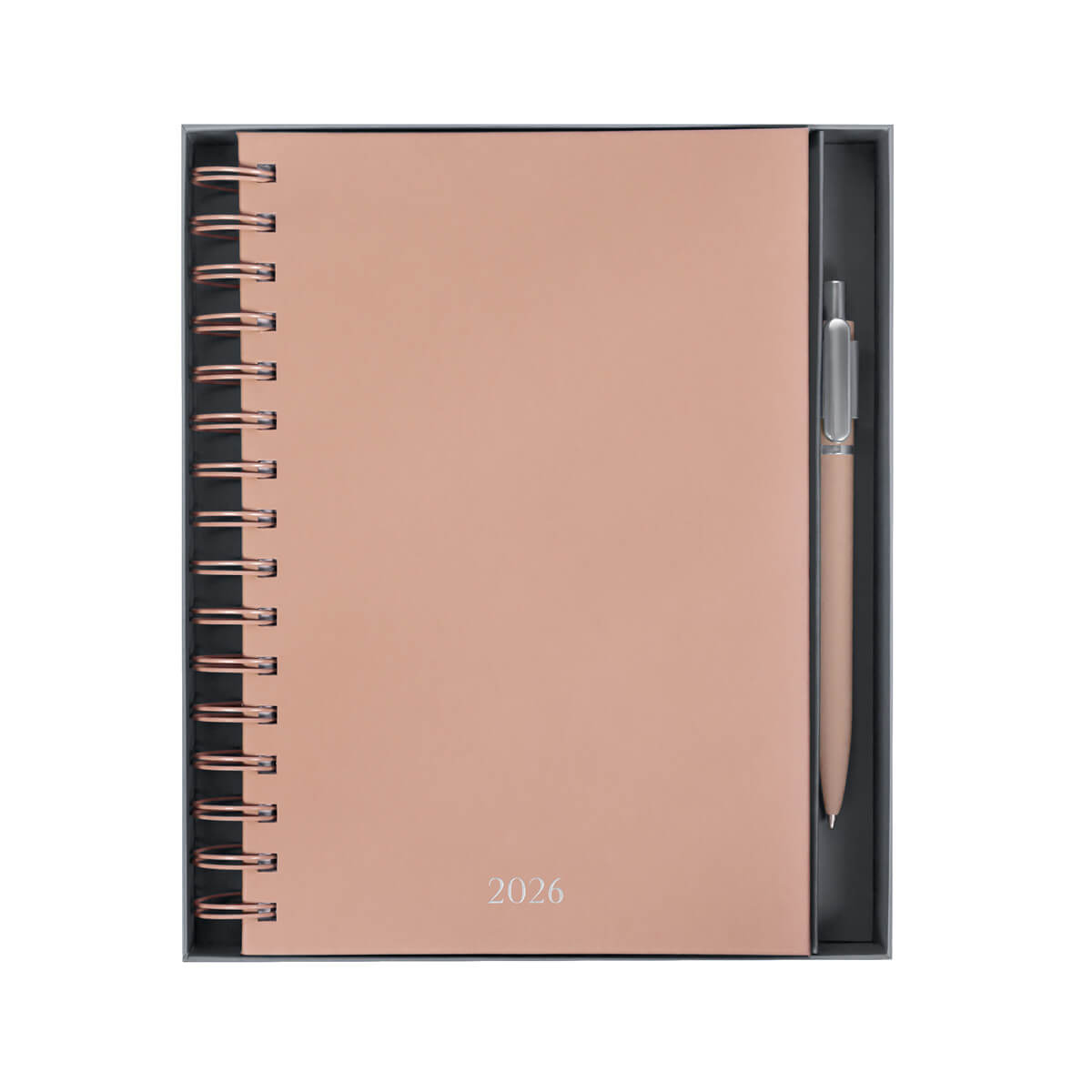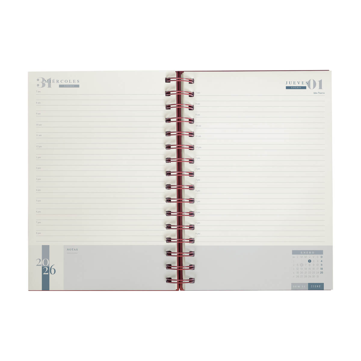 agenda diaria con 174 hojas. contiene datos personales, calendarios 2025-2026-2027, planeador 2026, seguimiento de nuevos hábitos y días festivos. incluye bolígrafo metálico y caja individual tipo regalo.