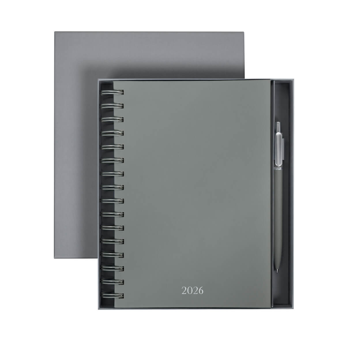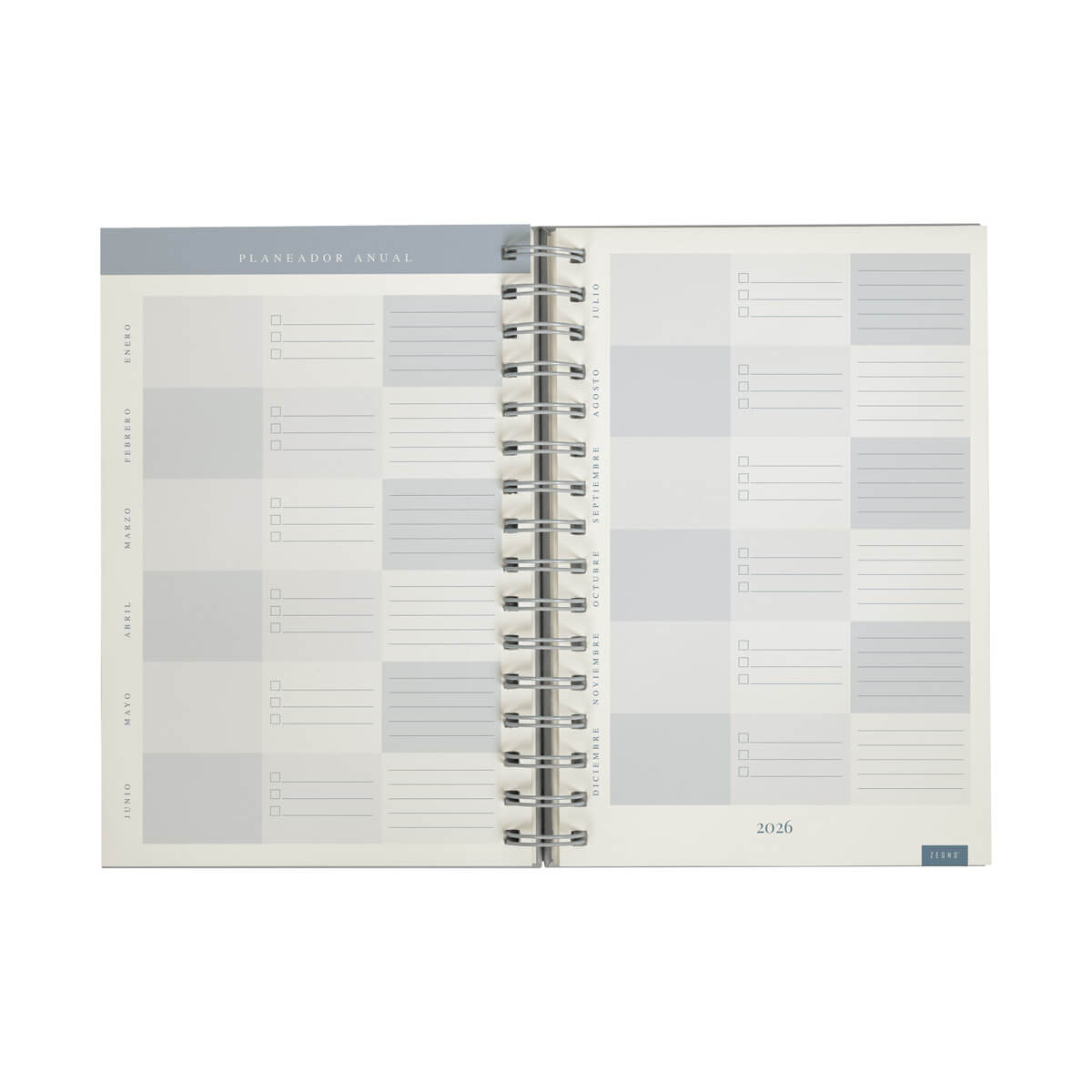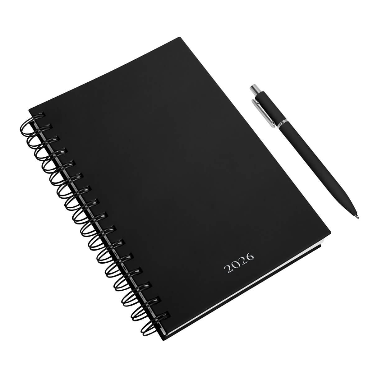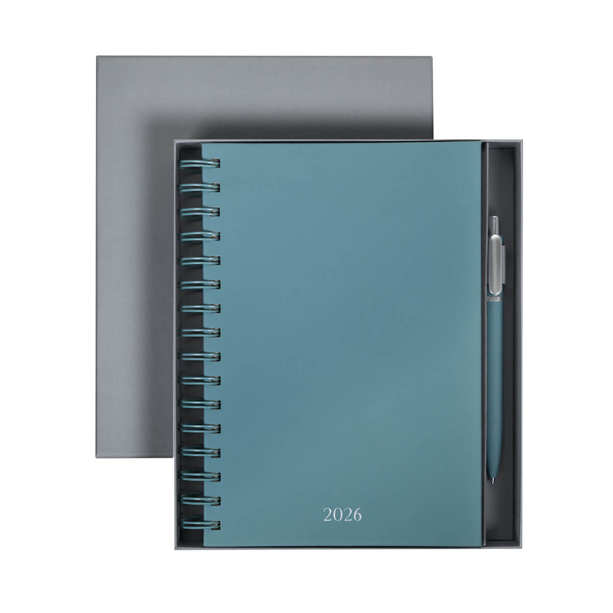 agenda diaria con 174 hojas. contiene datos personales, calendarios 2025-2026-2027, planeador 2026, seguimiento de nuevos hábitos y días festivos. incluye bolígrafo metálico y caja individual tipo regalo.