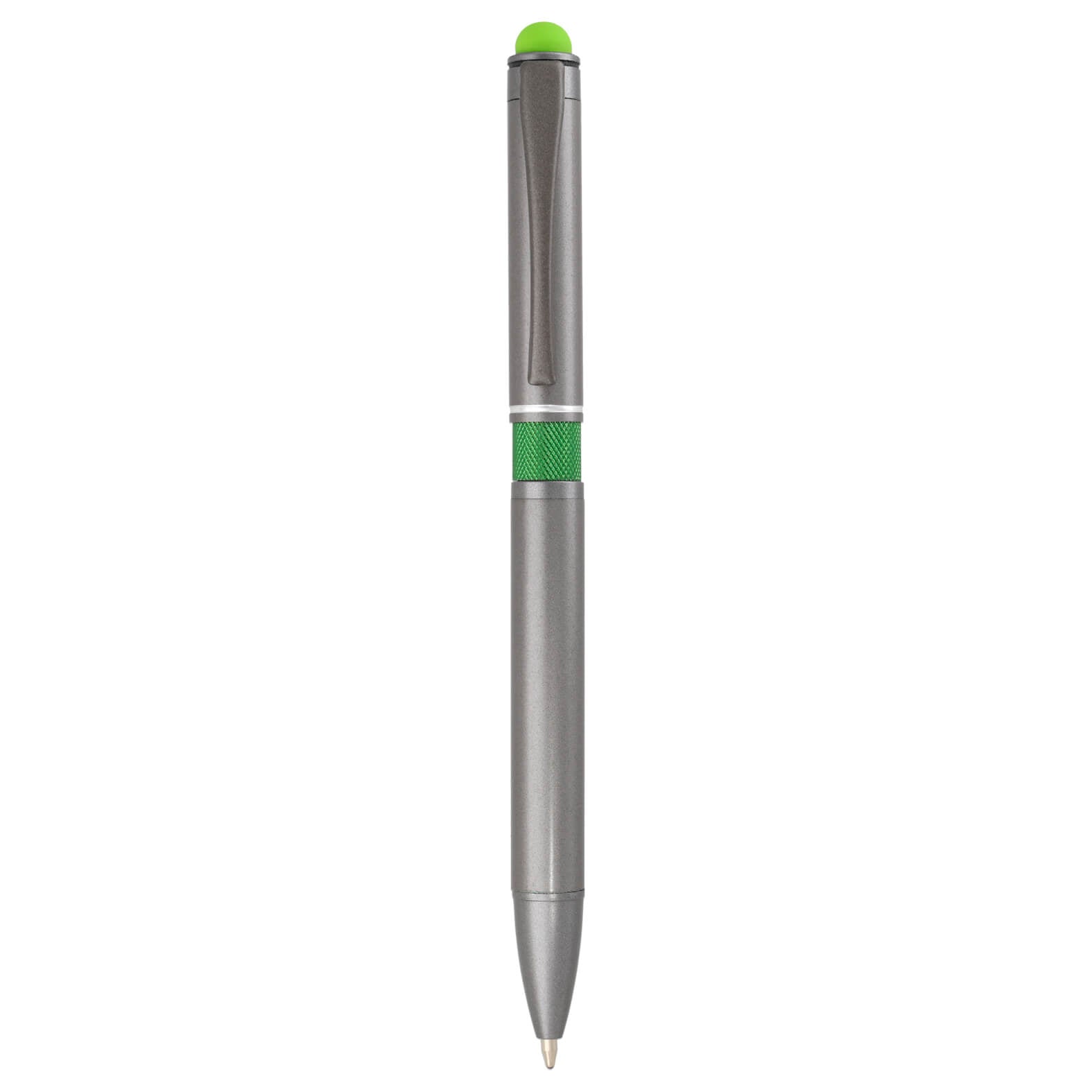 bolígrafo metálico con detalle en el centro, clip, goma touch screen y mecanismo de click.