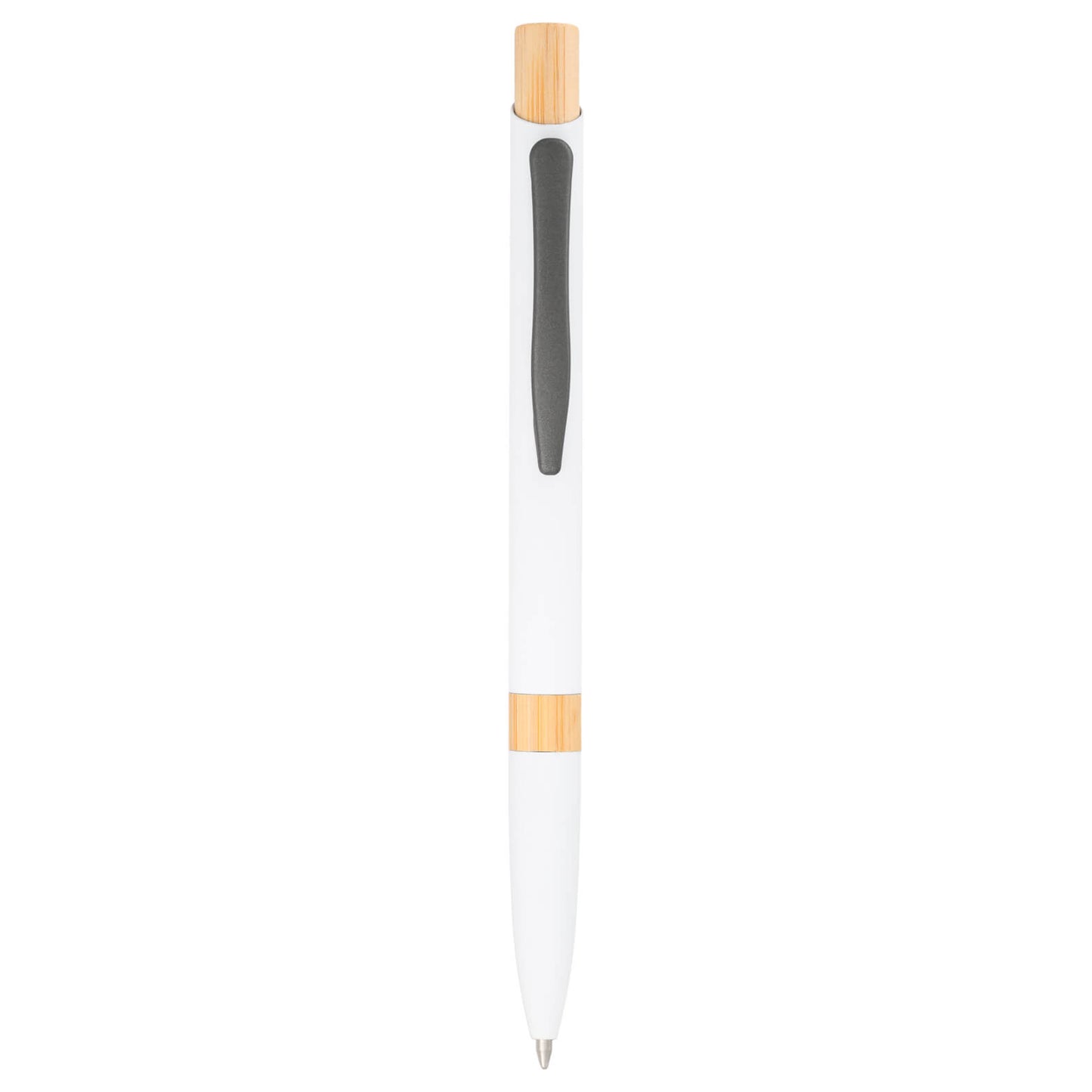 bolígrafo metálico con acabado rubber, detalle en bambú, clip y mecanismo de click.