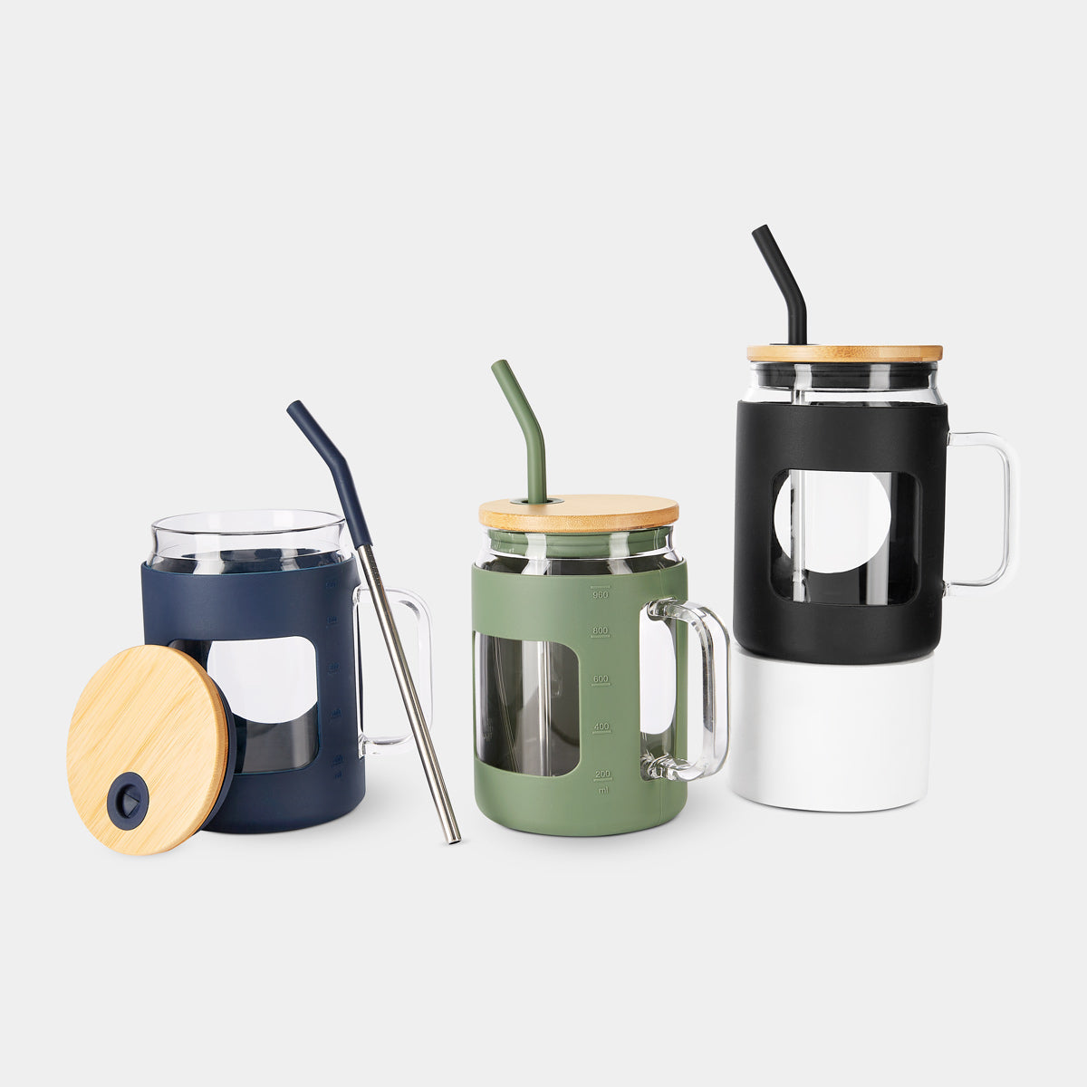 cilindro de vidrio con asa y manga de silicón graduada en ml. tapa de bambú con sistema de push y ranura para popote. incluye popote metálico con boquilla de silicón. vidrio resistente a bebidas calientes y frías. caja individual incluida. el bambú es un producto natural el cual puede presentar variaciones en tonalidades y vetas.