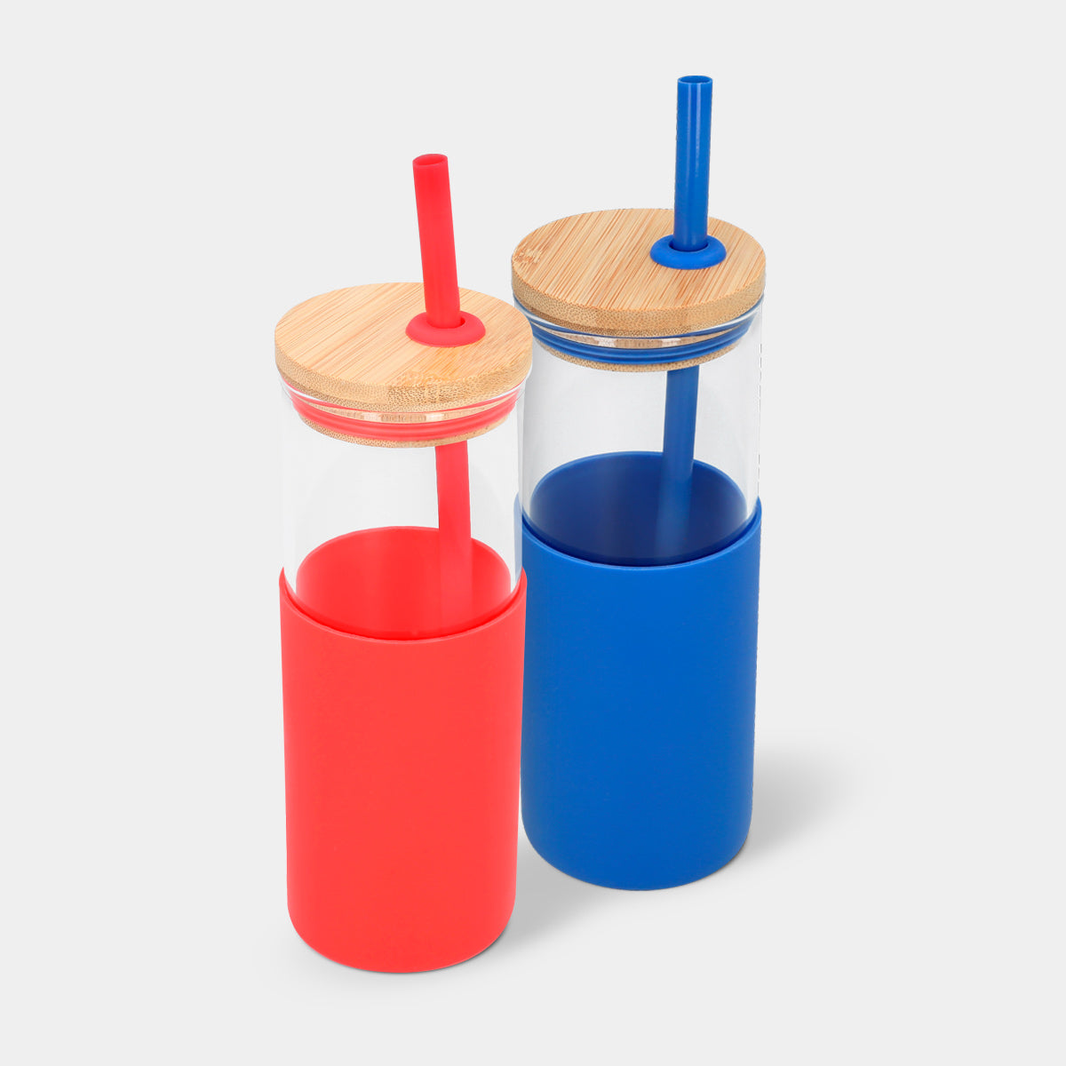 cilindro de vidrio con manga de silicón removible, tapa de bambú y popote de silicón. incluye caja individual. el bambú es un producto natural el cual puede presentar variaciones en tonalidades y vetas.