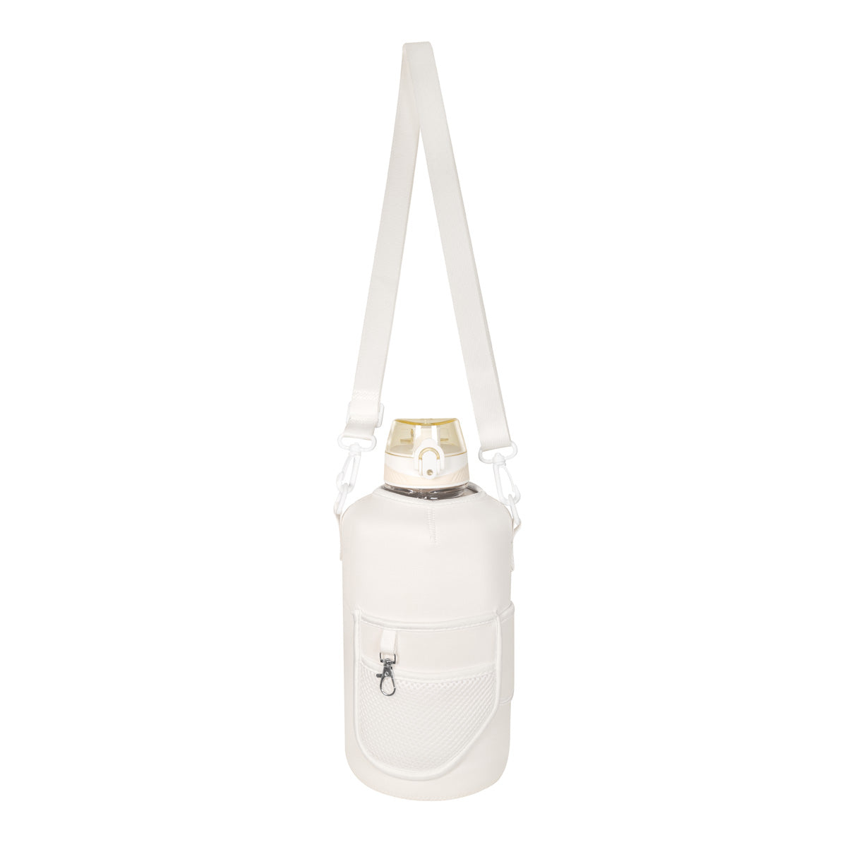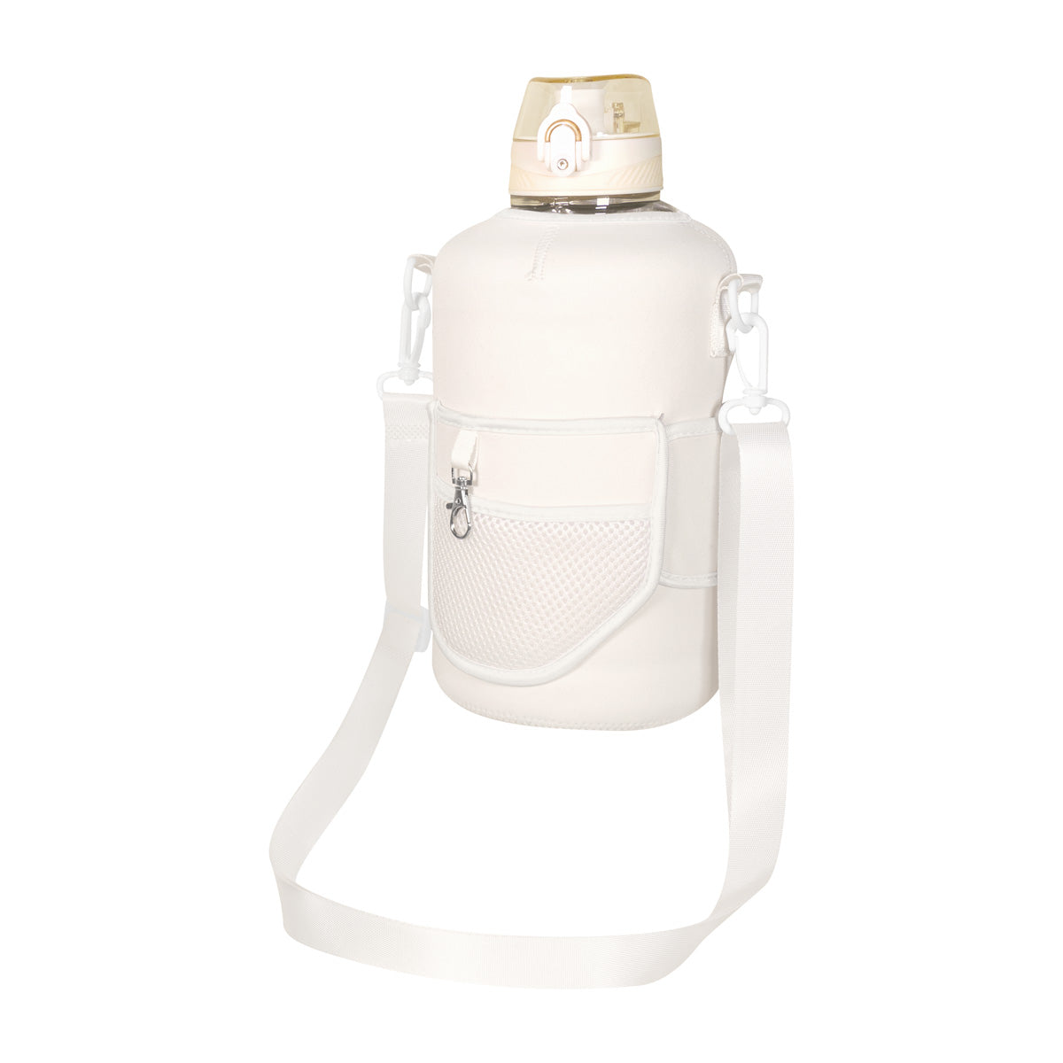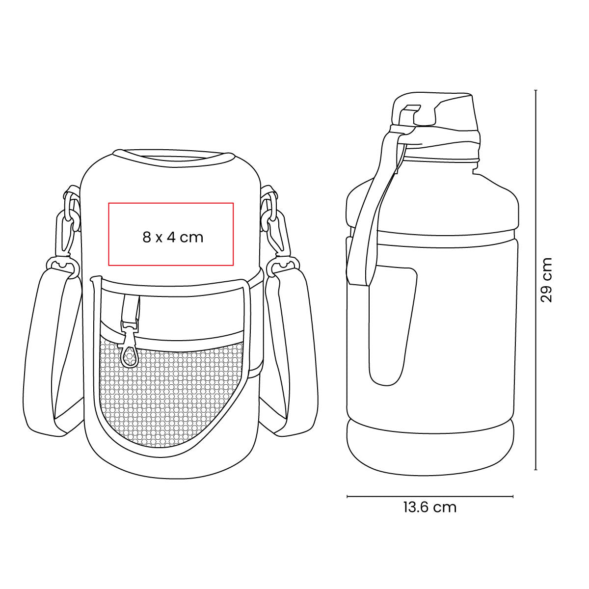 cilindro con pared sencilla de plástico. incluye funda removible de neopreno. tapa de plástico con sistema de rosca y sobretapa que agrega un clip de seguridad para evitar derrames. su tamaño esta diseñado para quienes necesitan llevar una gran cantidad de agua de manera práctica, es perfecto para actividades intensas, largas jornadas o aventuras al aire libre, asegurando que nunca te falte agua. los bolsillos de su funda, te permiten organizar tus artículos esenciales y no perderlos de vista mientras te ejercitas y su correa ajustable lo hace ideal para llevarlo contigo sin mayor esfuerzo.