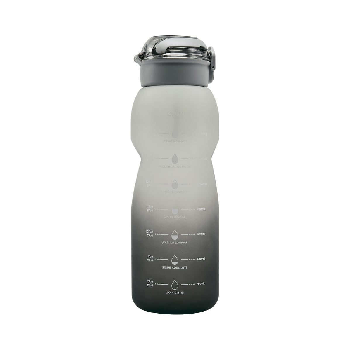 tapa de plástico con cierre de rosca y boquilla, sobretapa push con botón de seguridad y asa plegable. cuerpo con terminado rubber, resaques laterales para un mejor agarre, indicador de mililitros y horas para motivar y controlar tus hábitos de hidratación. incluye filtro de plástico y caja individual.
