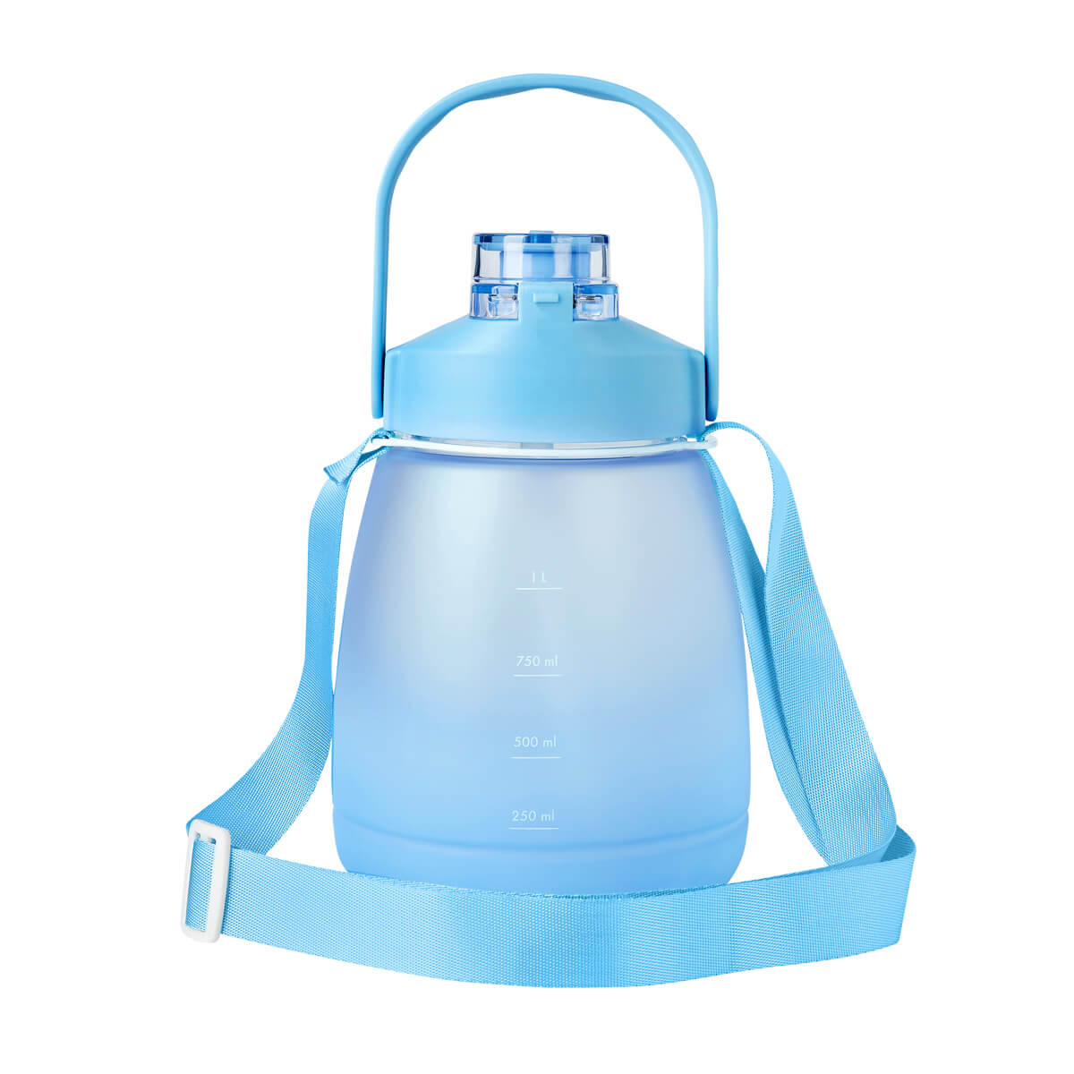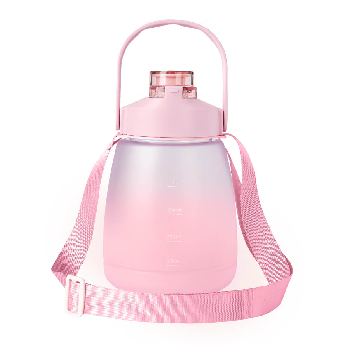 tapa de plástico con cierre de rosca y boquilla, sobretapa push con botón de seguridad y asa plegable. incluye asa de poliéster para transportarlo fácilmente. cuerpo con terminado rubber que lo hace suave al tacto. incluye indicador de mililitros para motivar y controlar tus hábitos de hidratación. incluye popote y caja individual.