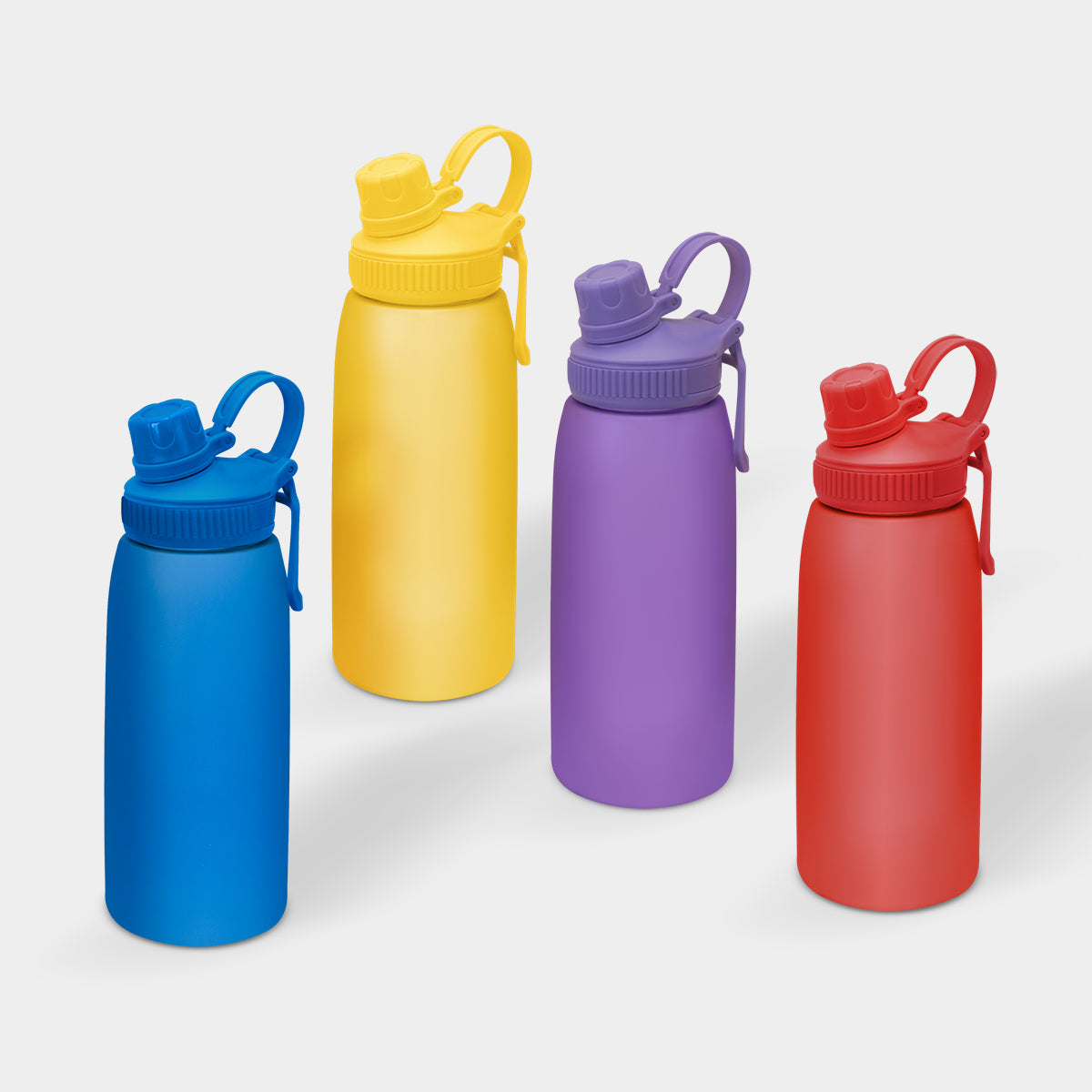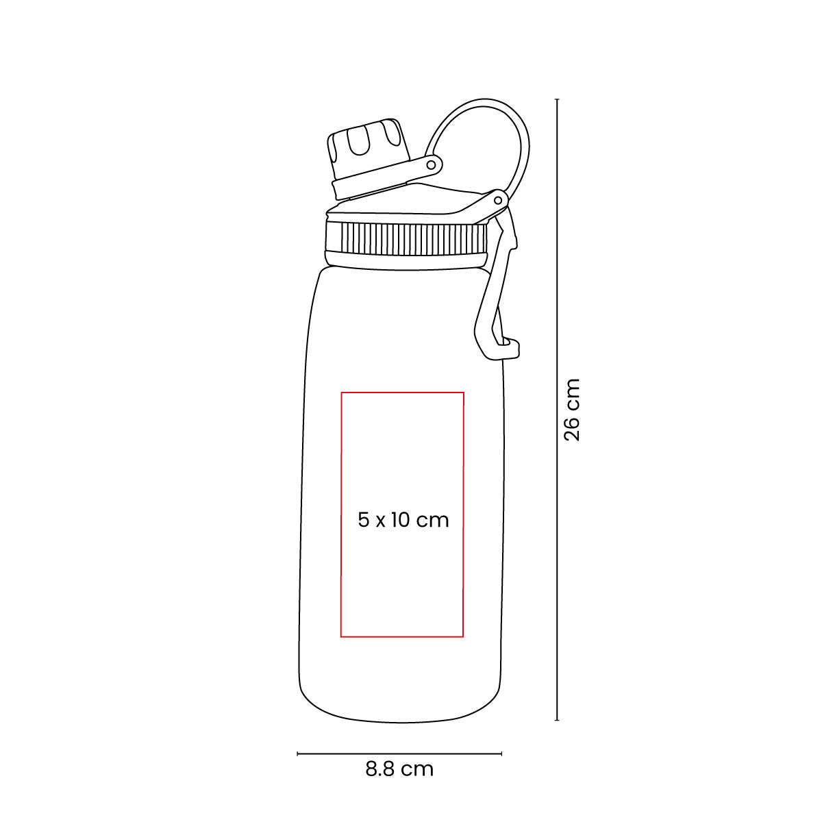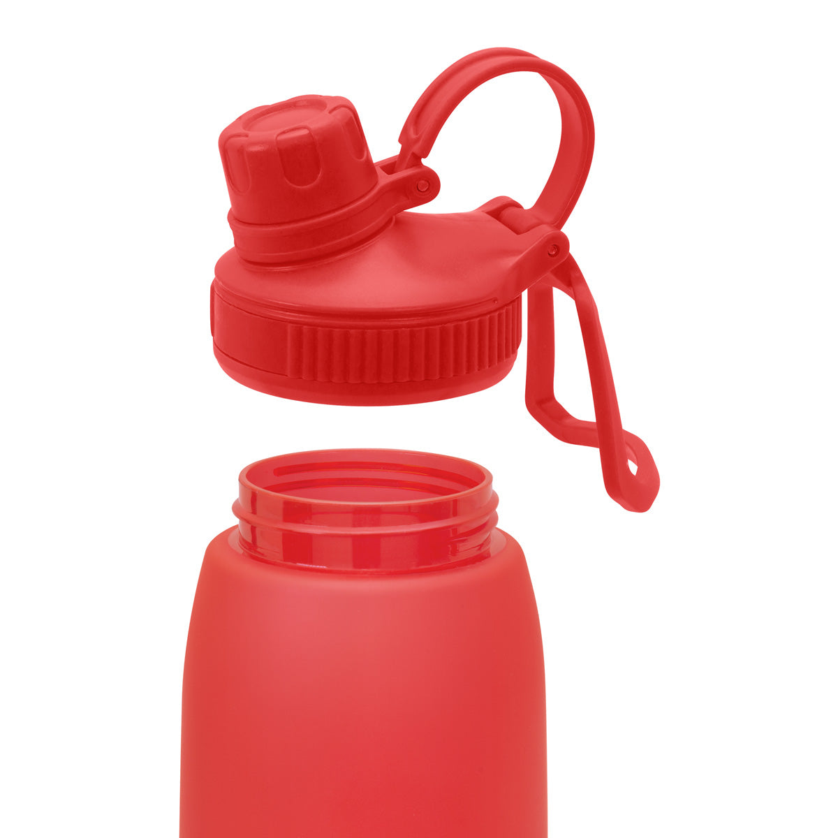 tapa de plástico con cierre de rosca y banda de silicón que ayuda a abrir y cerrar fácilmente. agrega una boquilla con sobretapa y asa plegable para llevarla contigo a donde quiera que vayas. incluye caja individual.