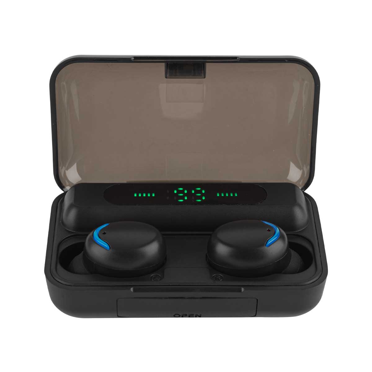 audífonos bluetooth inalámbricos con power bank de 1,500 mah. función manos libres. rango de conexión 10 metros. reproducción de música 5 hrs aproximadamente. incluye cable cargador usb, 4 repuestos de goma y estuche para recargar los audífonos con pantalla digital que indica el nivel de carga del power bank y los audífonos.