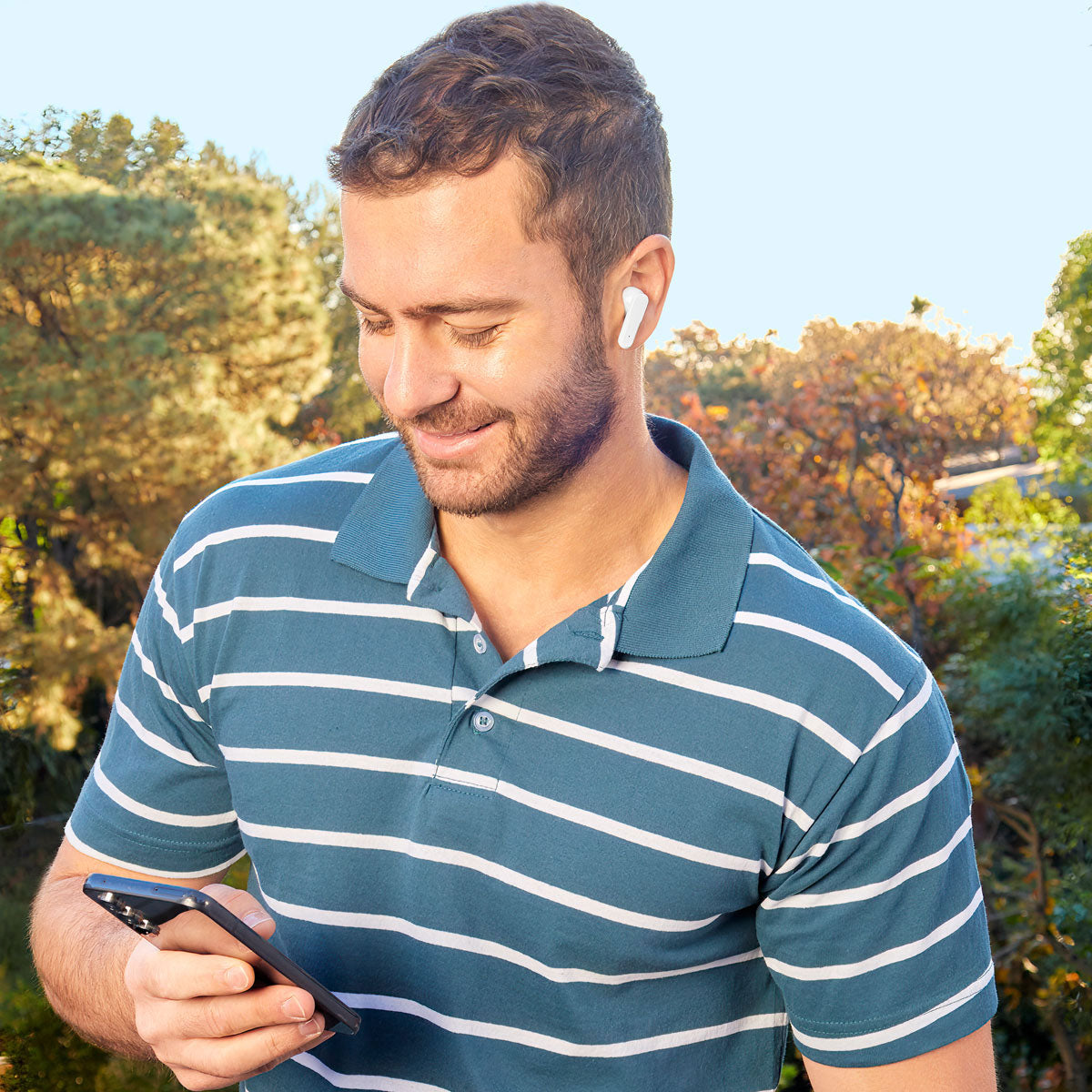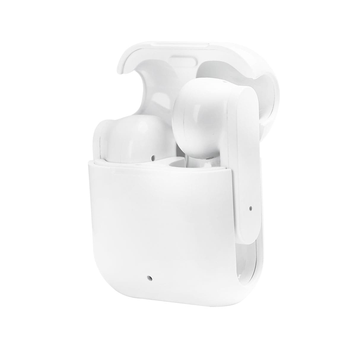 audífonos bluetooth inalámbricos con base recargable. control touch para reproducción de música y función de llamada. reproducción de música de 3 horas aproximadamente. rango de conexión de 10 metros. batería de 20 mah (audífonos) y 180 mah (estuche). incluye cable con puerto tipo c.