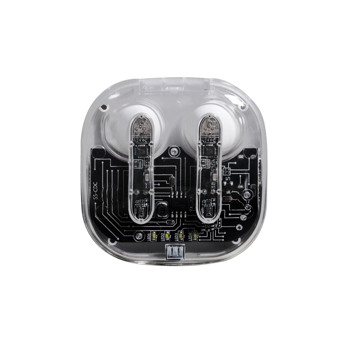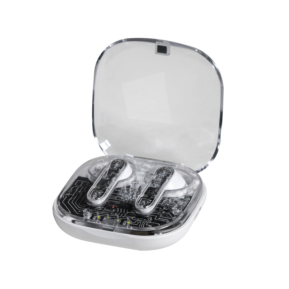 audífonos bluetooth con base recargable. su diseño permite una visión a su circuito interno gracias a su estructura transparente. reproduce tu música favorita por 6 horas aproximadamente con un alcance de conexión de 10 metros. incluye estuche con conexión tipo c, cable de carga y caja individual.