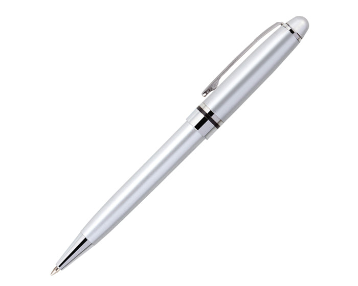 bolígrafo plástico con acabado metalizado, anillo y punta metálica. mecanismo retráctil.