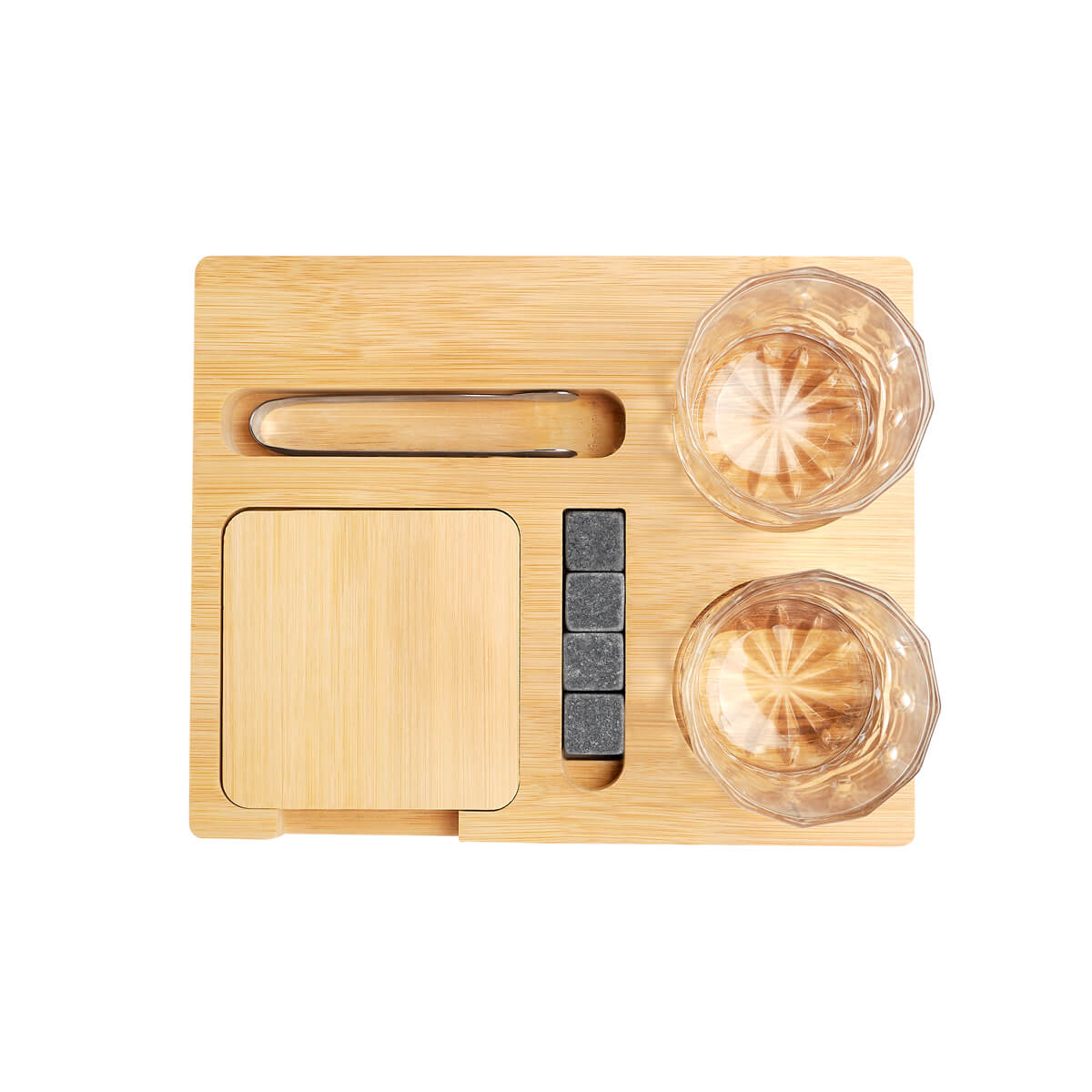 set de bar con base de bambú. incluye 2 vasos de cristal para whisky, 4 cubos enfriadores de granito, 2 portavasos de bambú y pinzas para hielo de acero inoxidable. incluye caja individual.