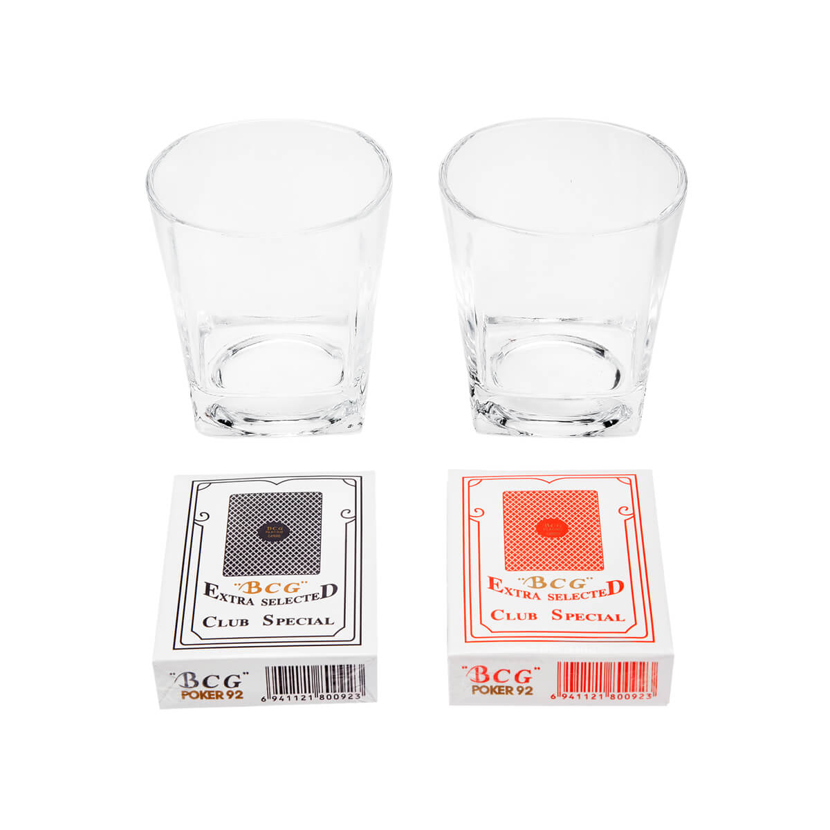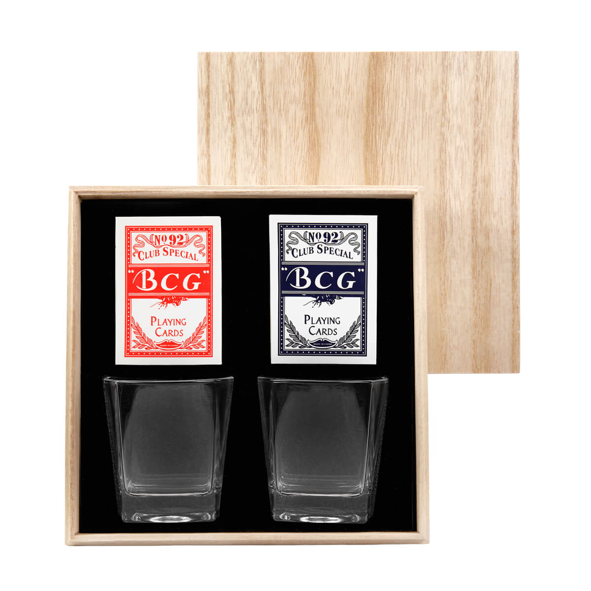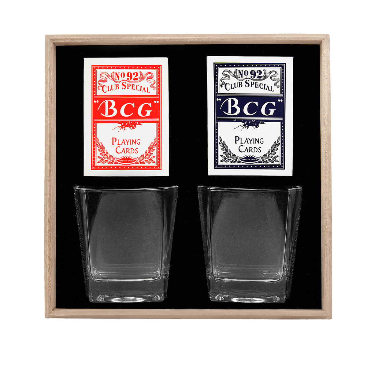 set de bar con 2 vasos whiskeros de cristal y 2 barajas para juego. su presentación lo hace perfecto para ocasiones especiales, desde celebraciones personales hasta un obsequio corporativo. incluye estuche de madera.