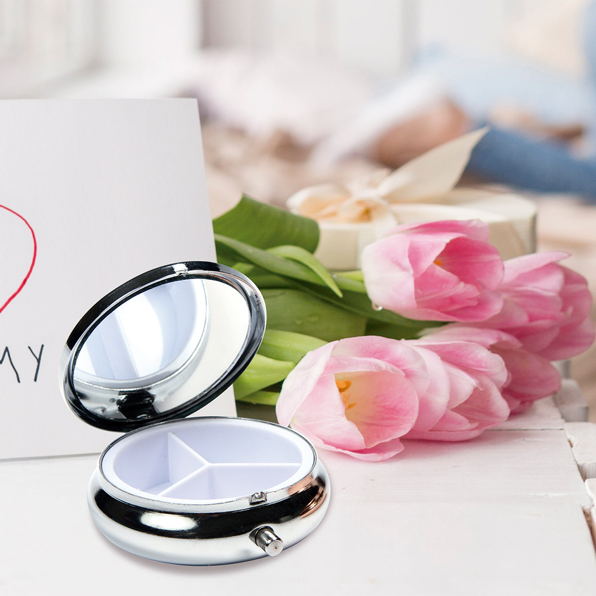 pastillero con espejo, fabricado en metal y plástico abs, con tres compartimentos.