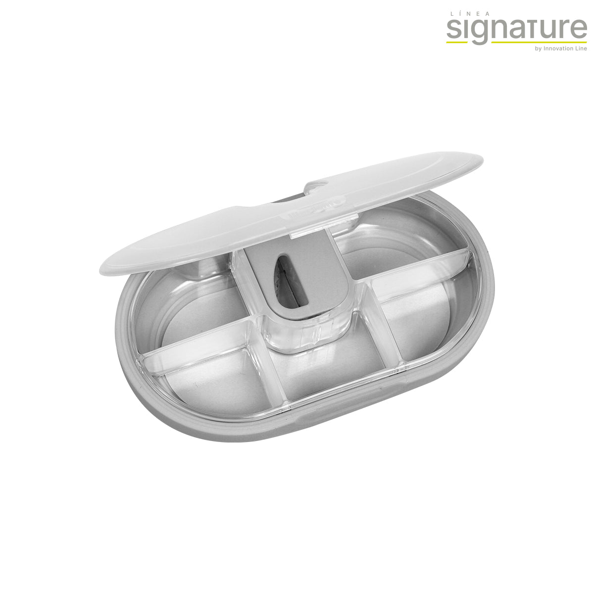 pastillero con forma ovalada, fabricado en plástico as (acrilonitrilo estireno), con cortador de acero inoxidable y 5 compartimentos.