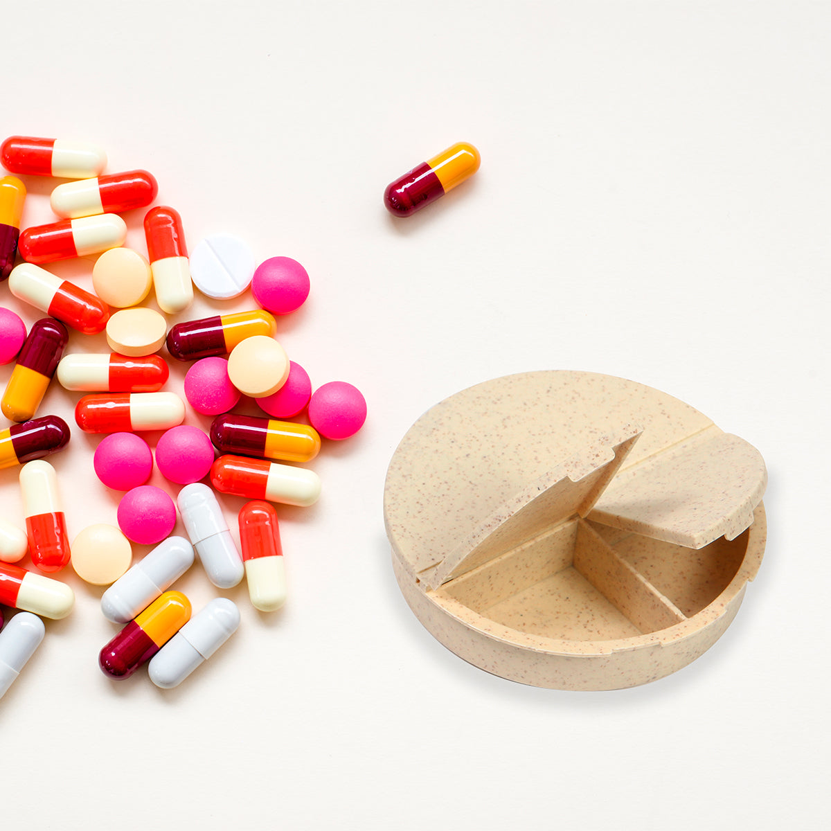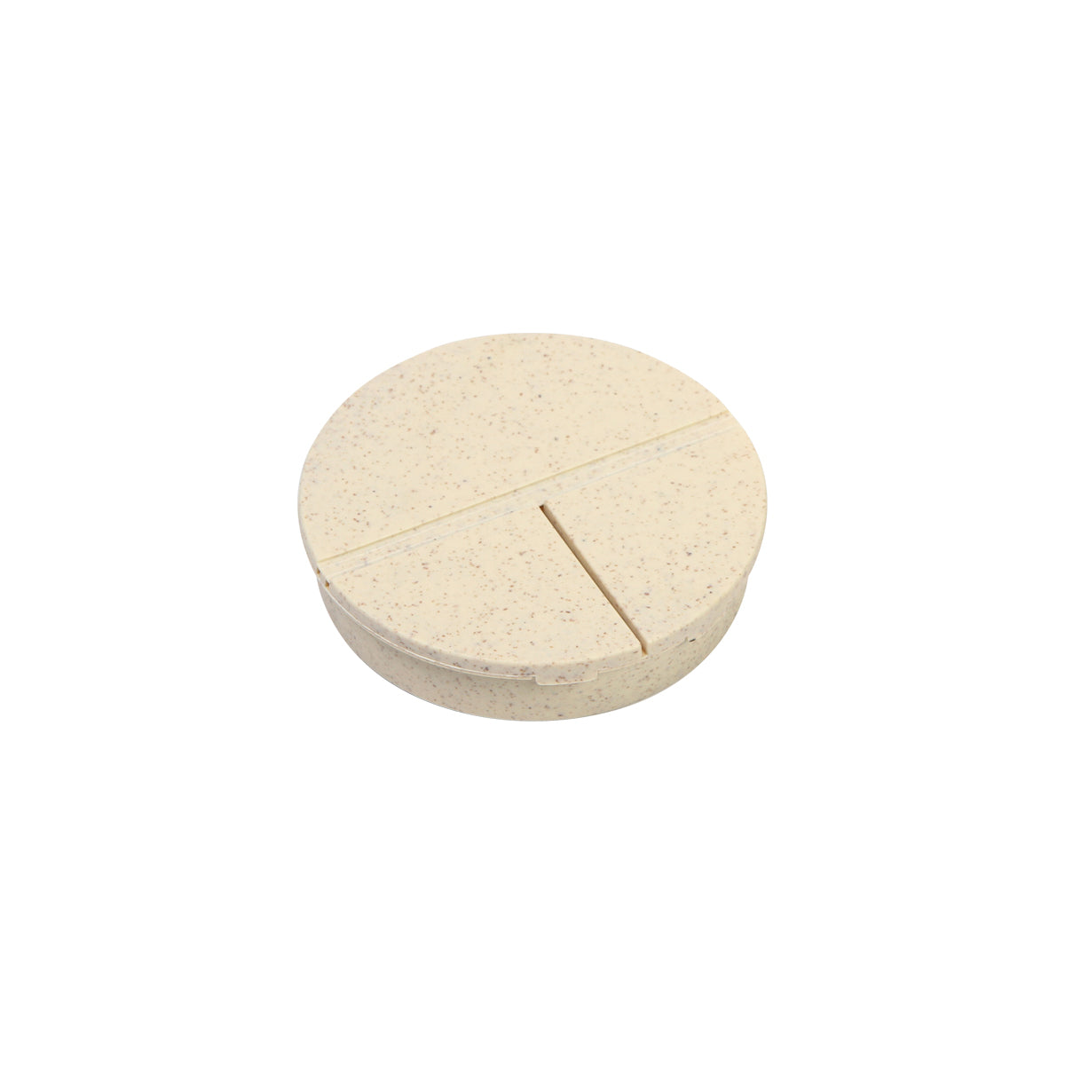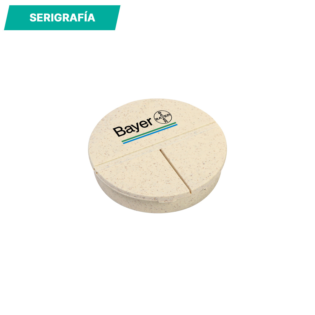 pastillero redondo fabricado en fibra de trigo, con 2 compartimentos pequeños perfectos para pastillas pequeñas y uno grande ideal para píldoras. se cierra y abre con gran facilidad. gracias a su tamaño es ideal para llevarlo contigo todos los días.