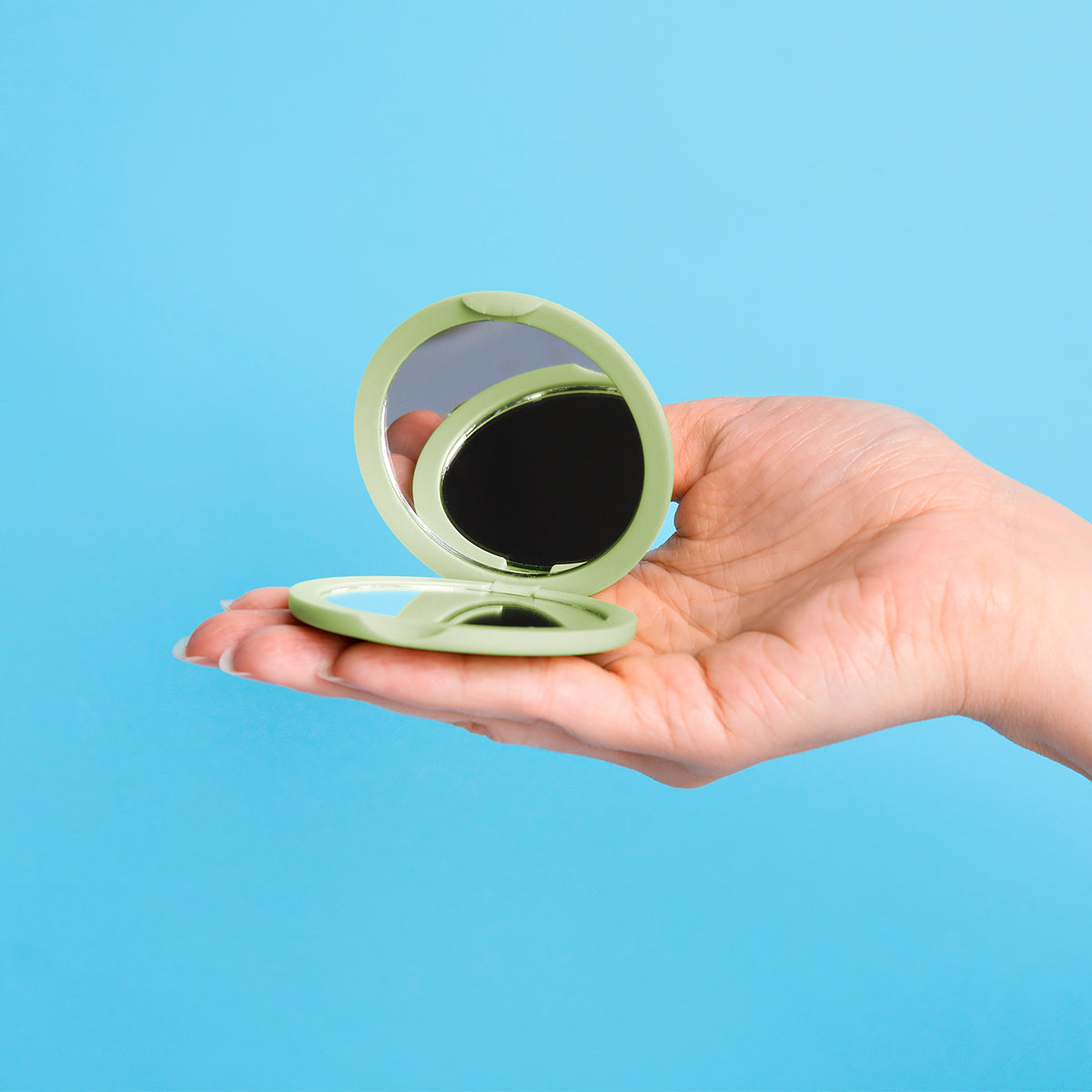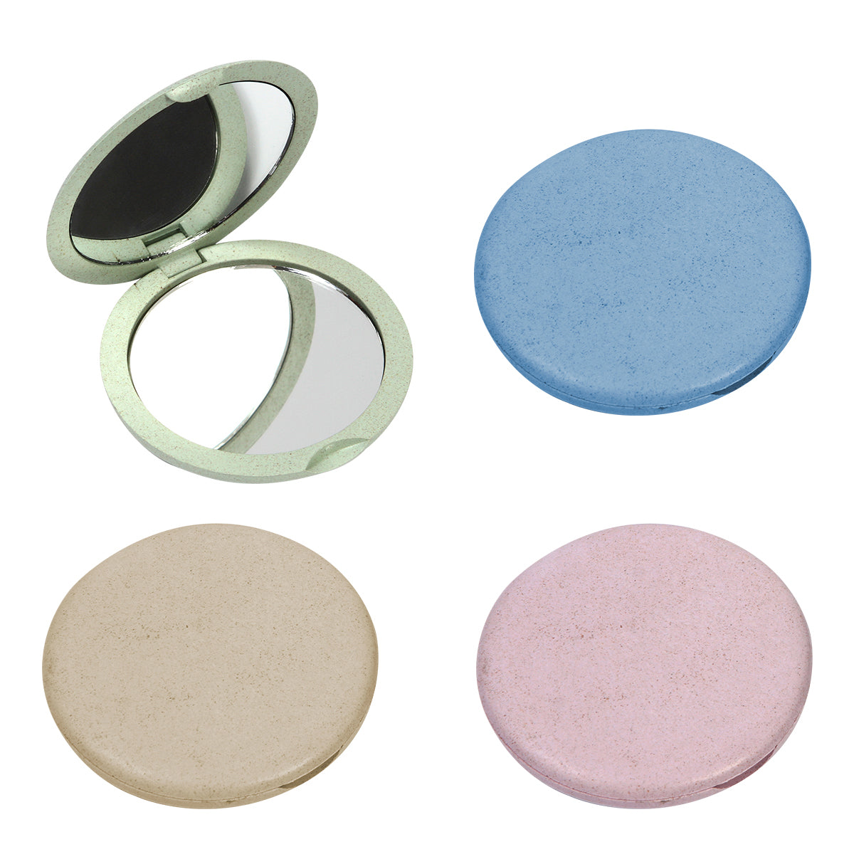 espejo circular fabricado en fibra de trigo y plástico pp. con espejo en ambas tapas. gracias a su tamaño y a que es bastante ligero, es ideal para llevarlo contigo todos los días.