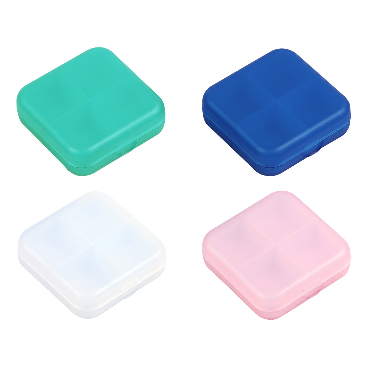 pastillero de plástico cuadrado con 4 compartimentos lo suficientemente amplios para guardar múltiples capsulas/píldoras, con cerradura de clip y acabado mate.