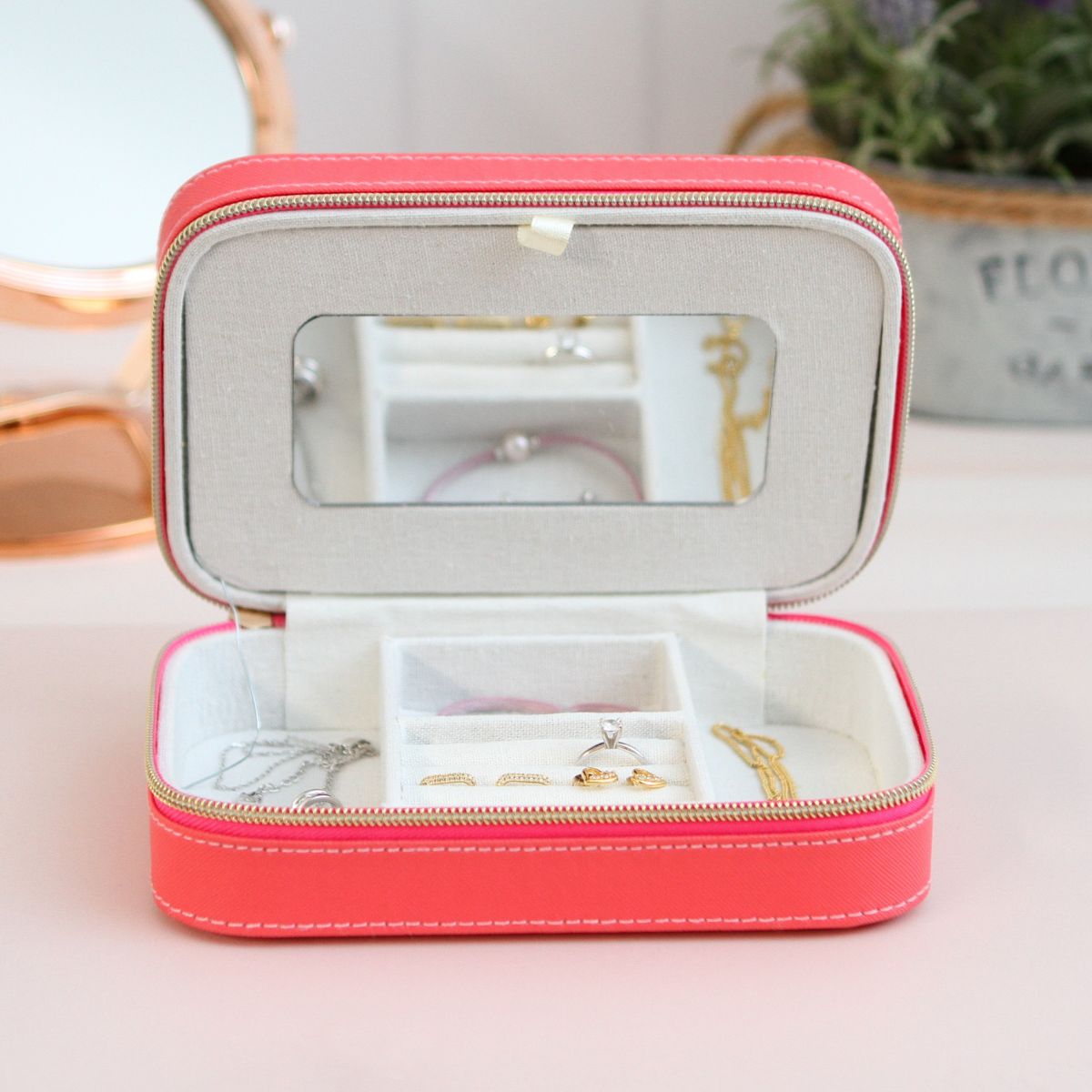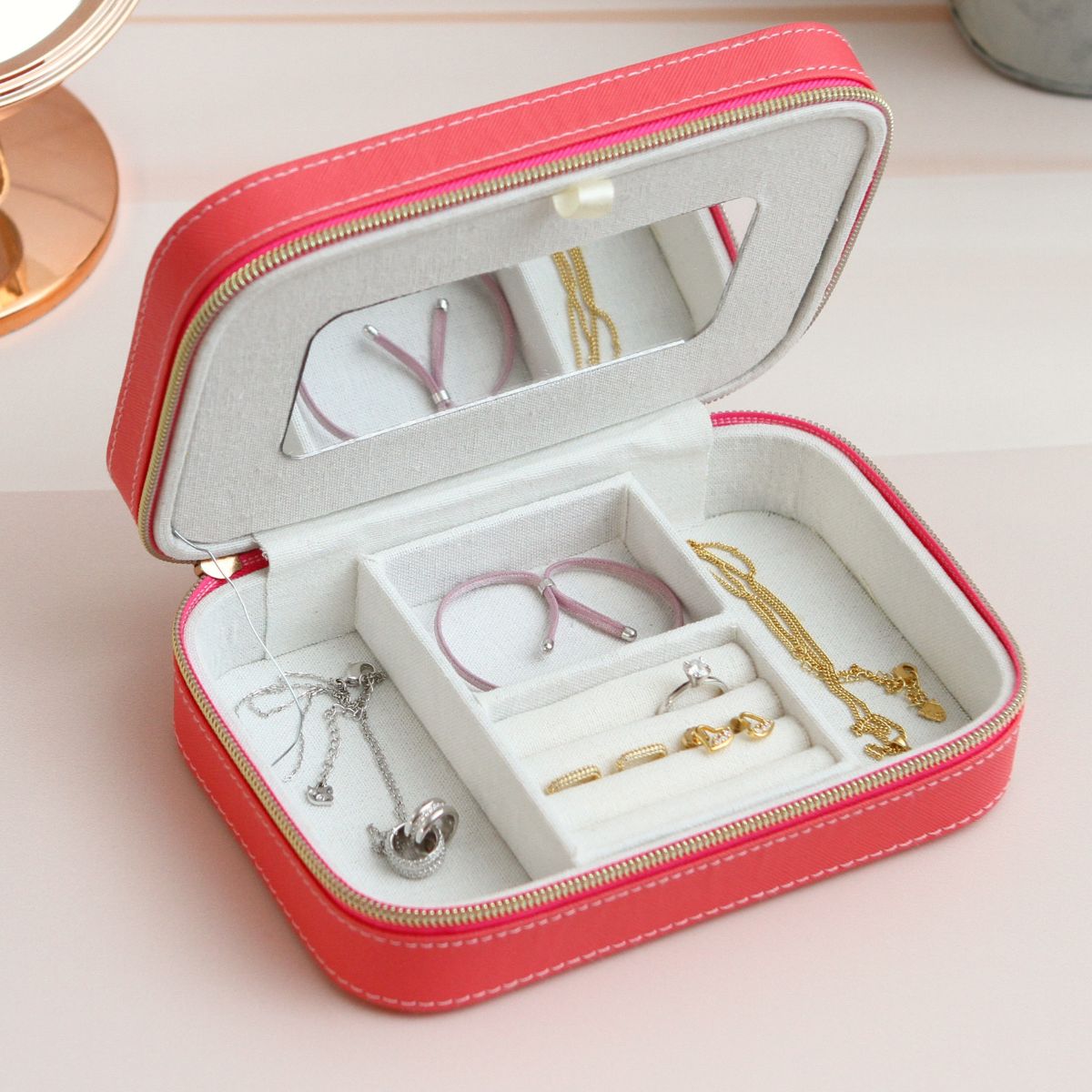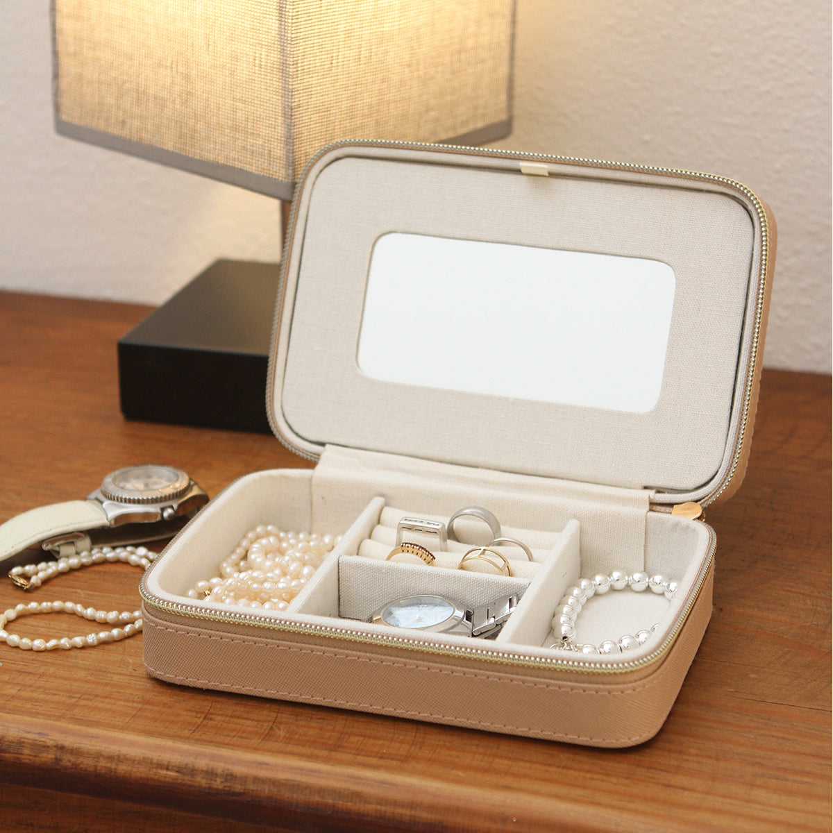 contenedor para almacenar joyería fabricado en cartón, curpiel y tela es una opción elegante y práctica para mantener tus joyas organizadas y protegidas. con sus diversos compartimentos internos, cuenta con un espejo. incluye caja de cartón individual.