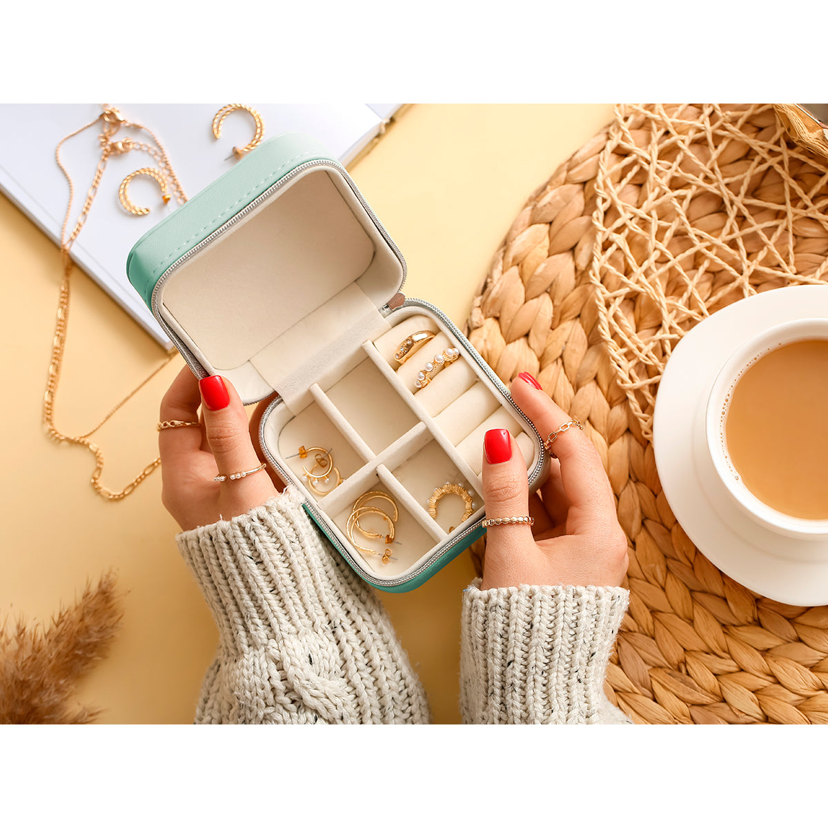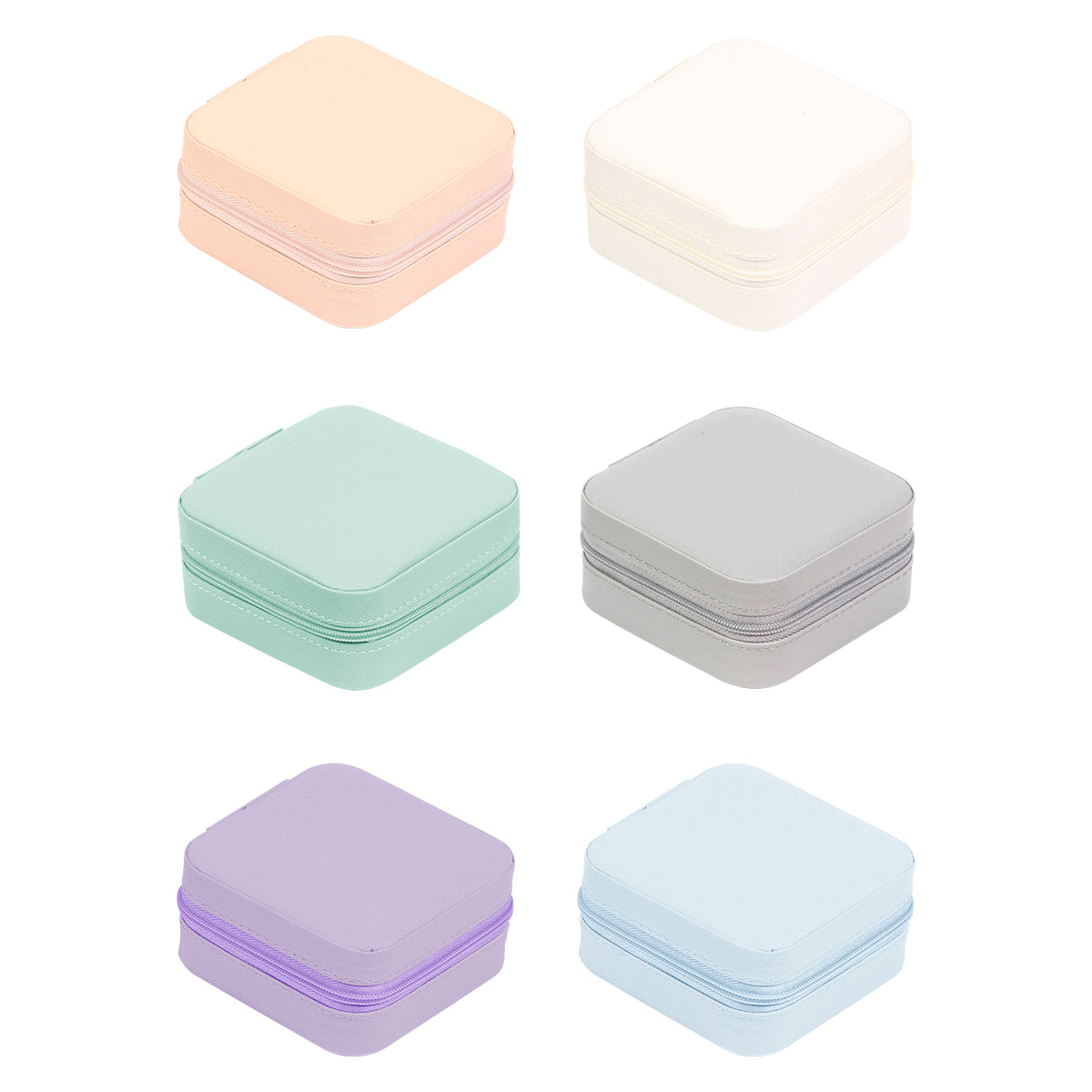organizador joyero fabricado en nylon y pvc, cuenta con cuatro compartimentos para alhajas y uno más para aretes. disponible en colores blanco, gris, rosa y verde.