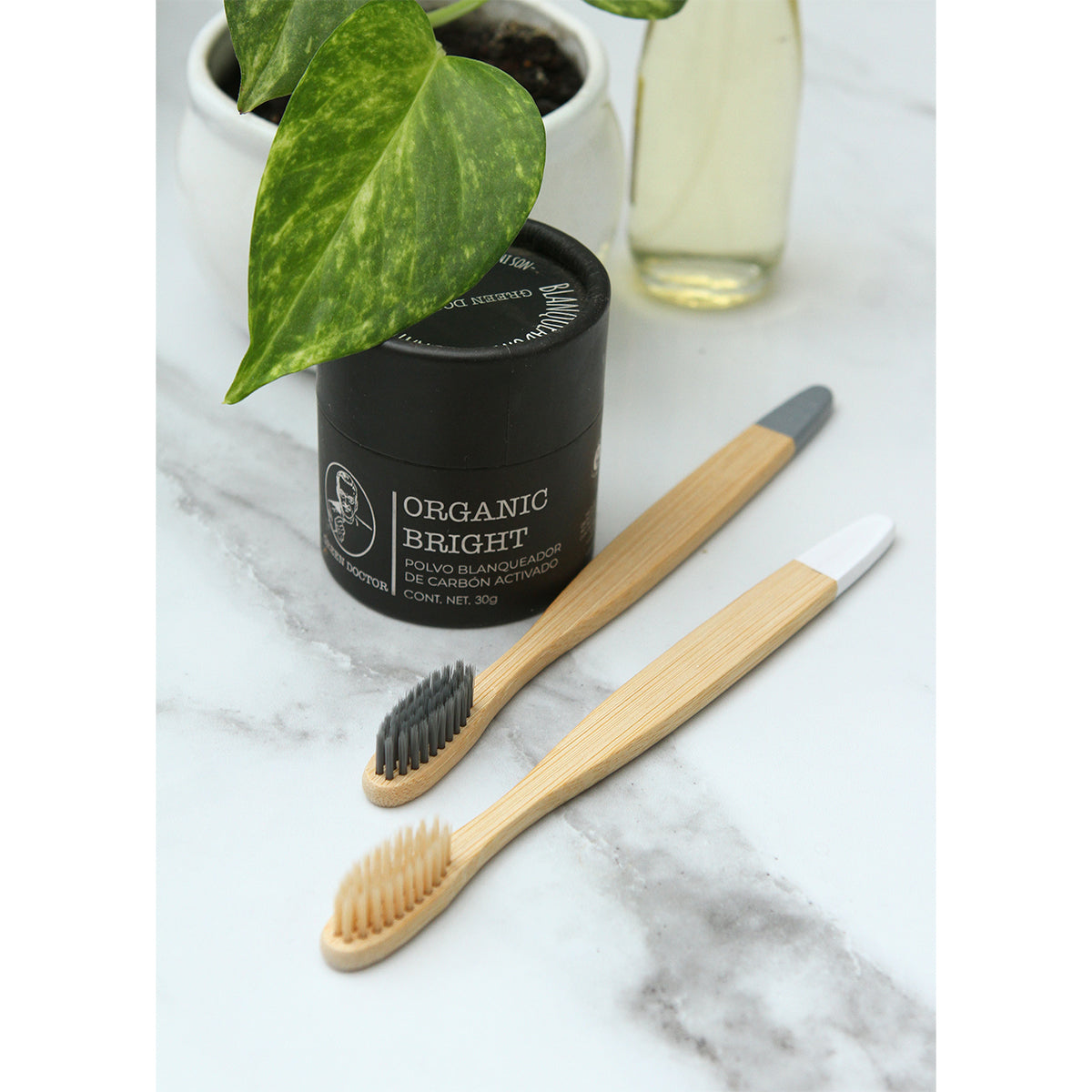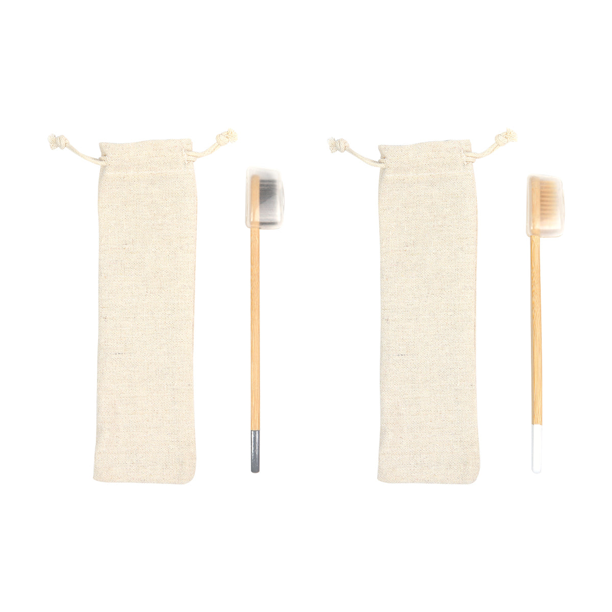 cepillo dental fabricado en madera de bambú con acabado en laca que le da un acabado brillante y es útil para una mayor resistencia a sustancias abrasivas y durabilidad. incluye un protector de plástico para las cerdas y una bolsita de algodón de medidas 22x3 centímetros. disponible con detalles en la punta inferior del cepillo en dos colores, gris y blanco.
