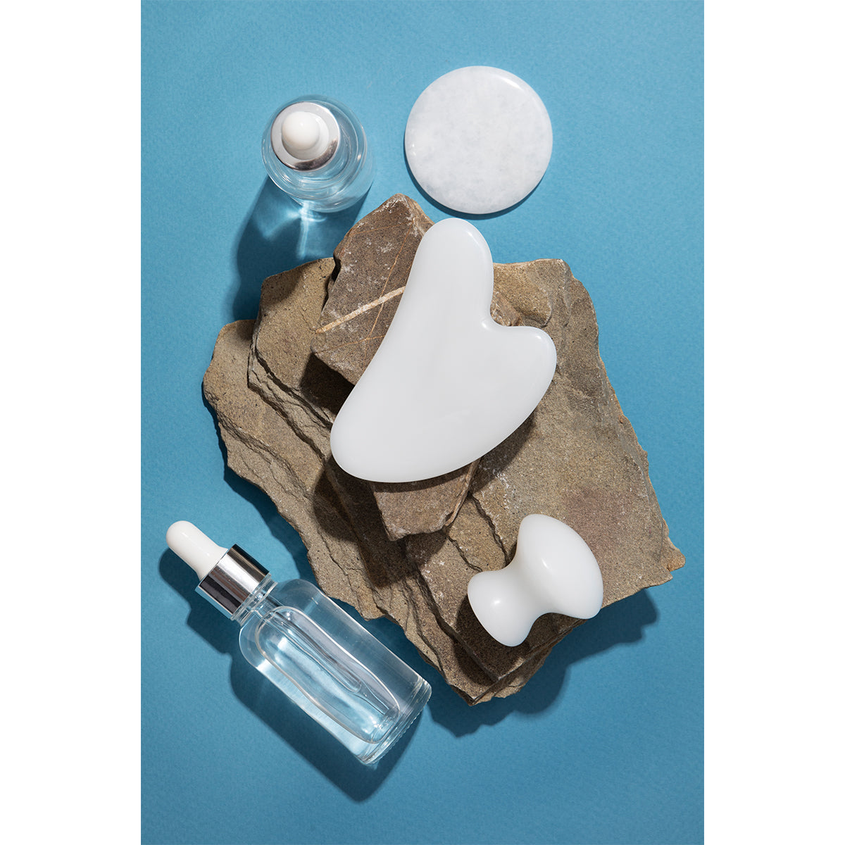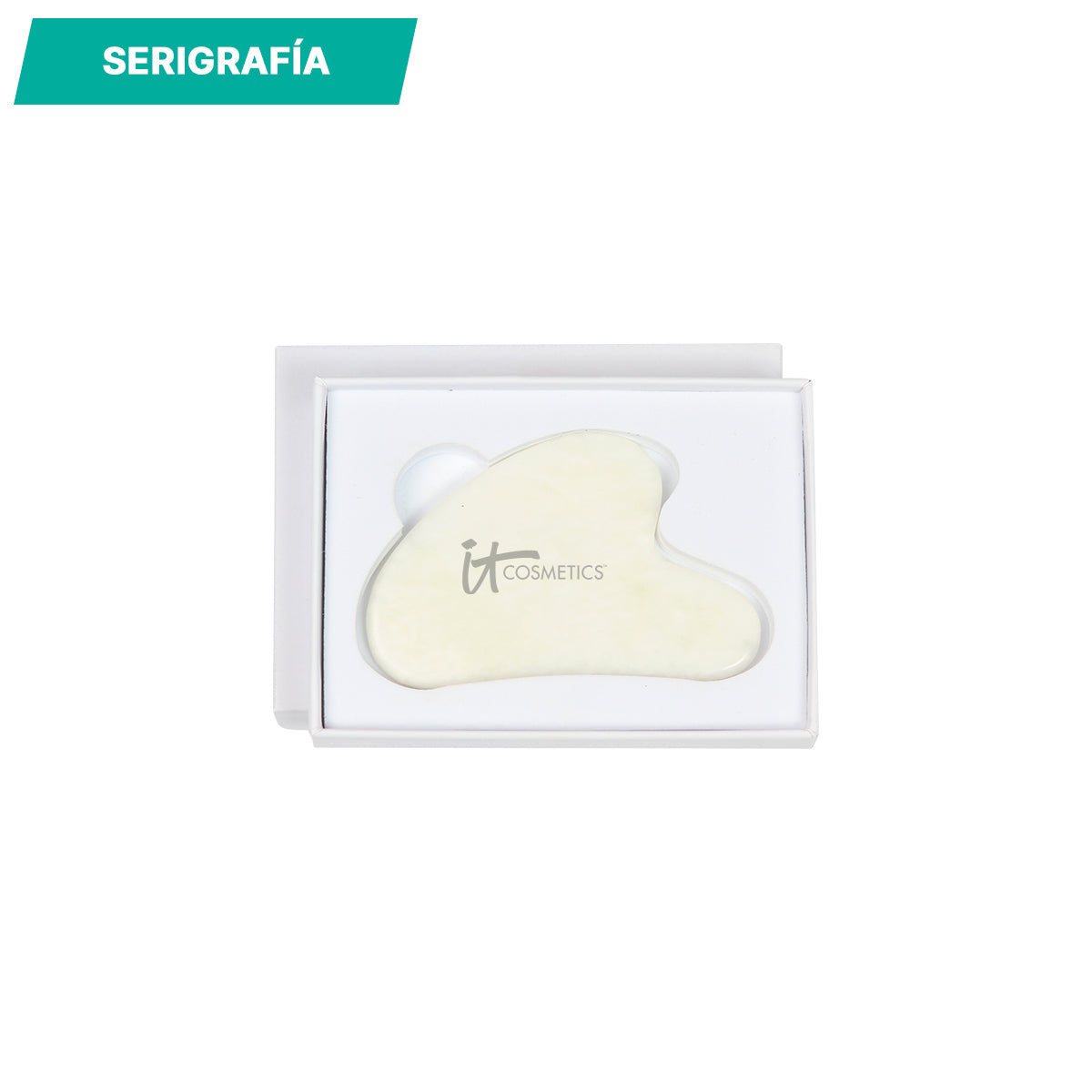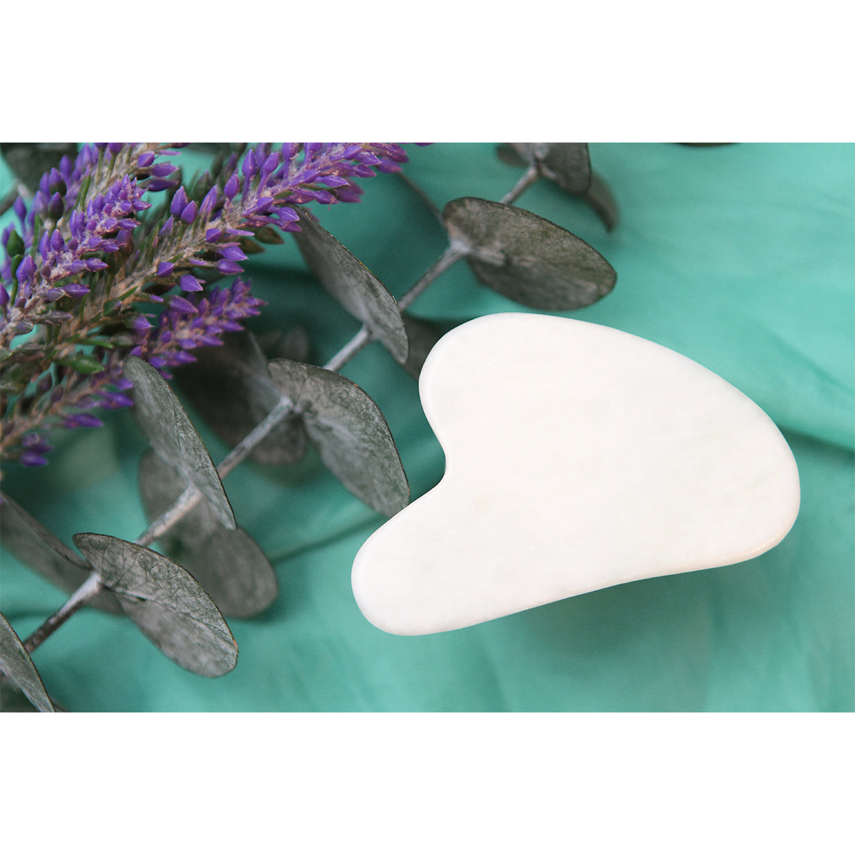 masajeador para el rostro tipo gua sha fabricado en piedra real pulida color blanco, incluye caja de cartón para regalo color blanca suajado a la forma del producto. este masajeador te ofrece una oportunidad única de mimarte y cuidar de tu piel de una manera lujosa y relajante. es perfecto para aquellos que buscan una rutina de cuidado facial efectiva, holística y elegante.
