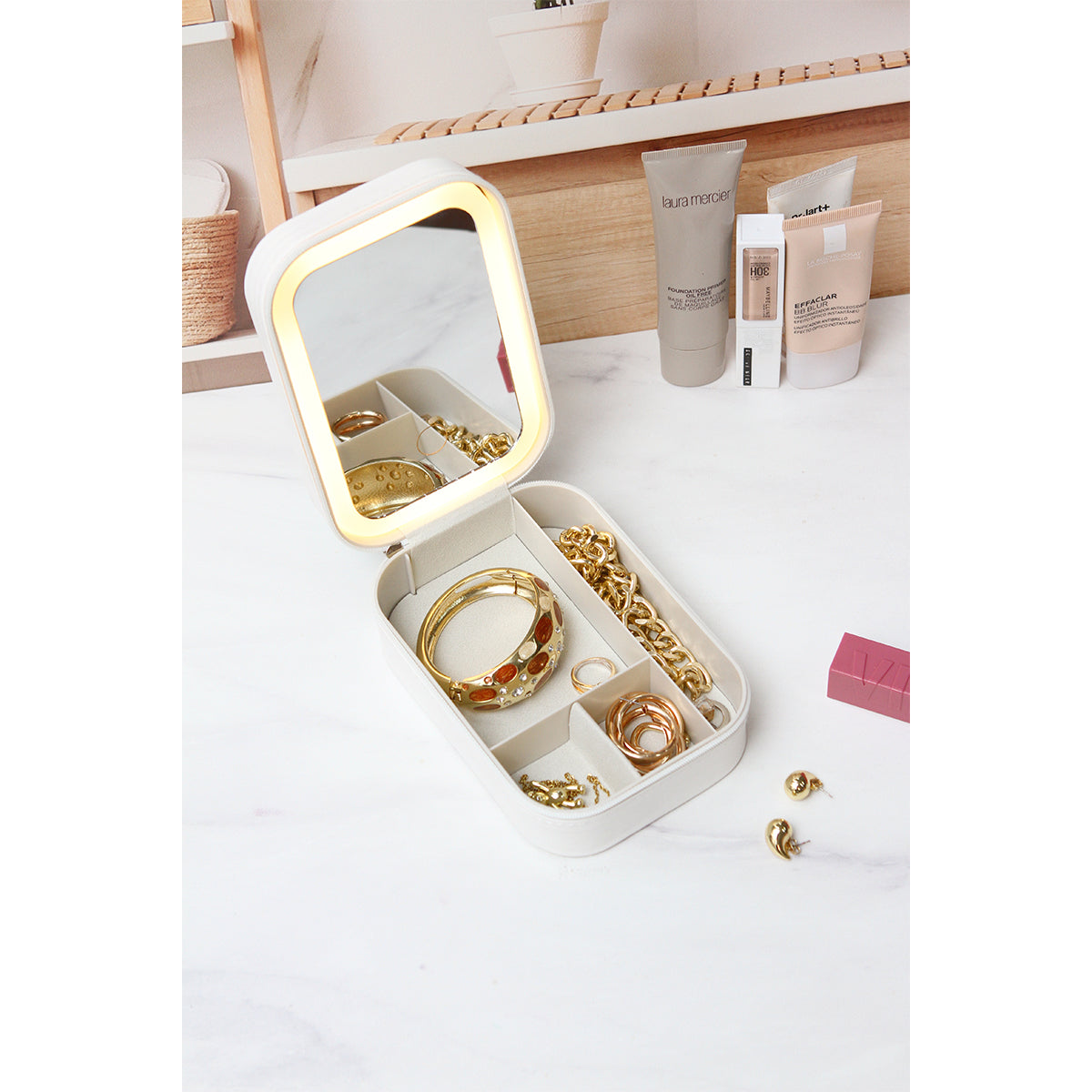contenedor para almacenar joyería con espejo con luz led fabricado en plástico. tres intensidades de luz, cuenta con varios compartimentos para diferentes artículos y un cable de carga tipo usb de 1 metro de largo. es una opción elegante y práctica para mantener tus joyas organizadas y protegidas. con sus diversos compartimentos internos.