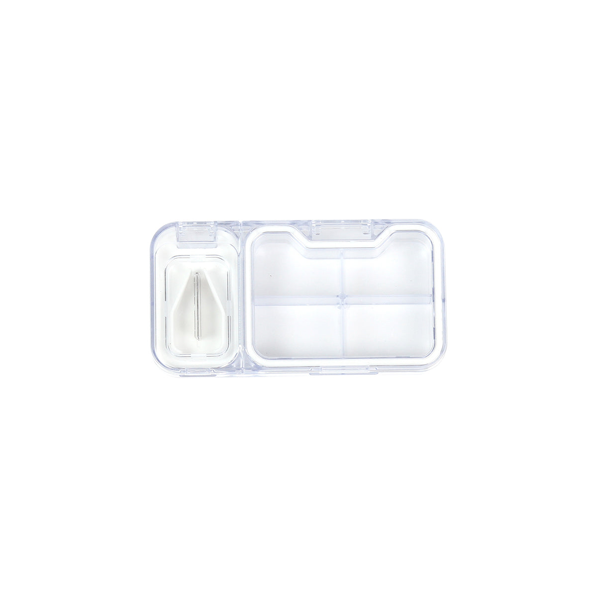 pastillero fabricado en plástico tipo ps, con silicón en la tapa para un mejor cerrado, incluye navaja de acero inoxidable. tiene 4 compartimentos espaciosos perfectos para píldoras, pastillas, tabletas, etcétera.