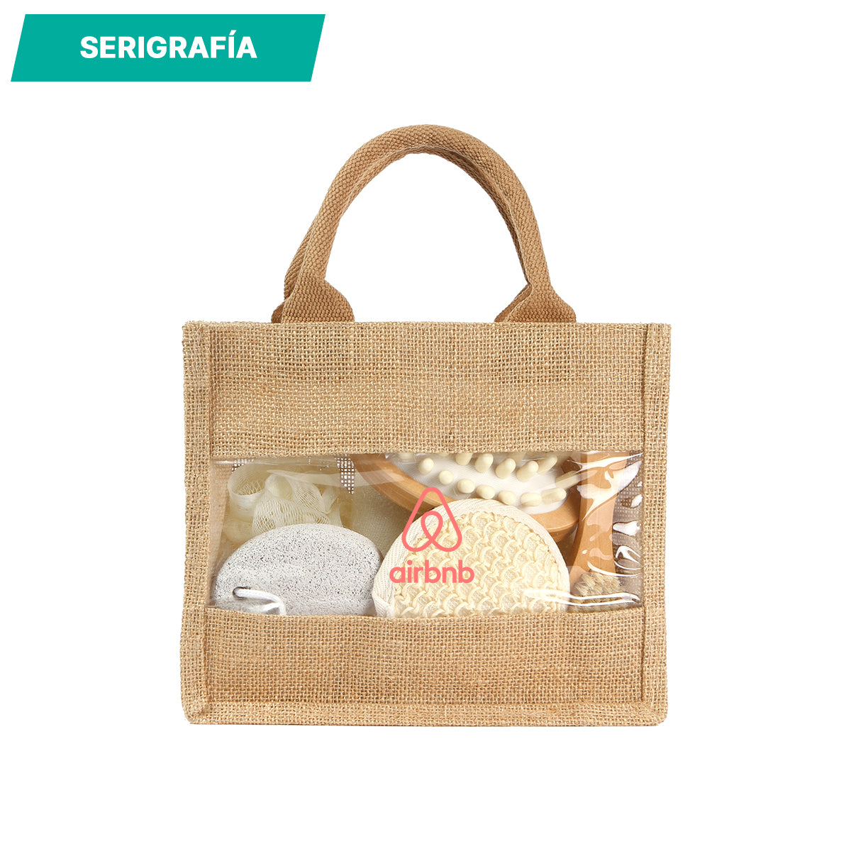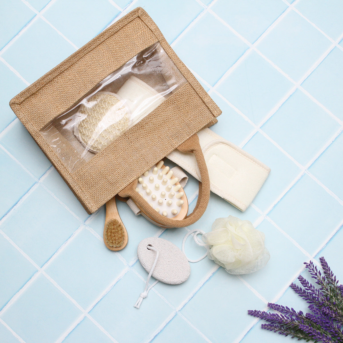 juego de baño de seis piezas, incluye cepillo ovalado, esponja corporal, cepillo, piedra, esponja para la cara y tira de baño. incluye bolsa acabado yute con 2 asas y ventana transparente al frente.