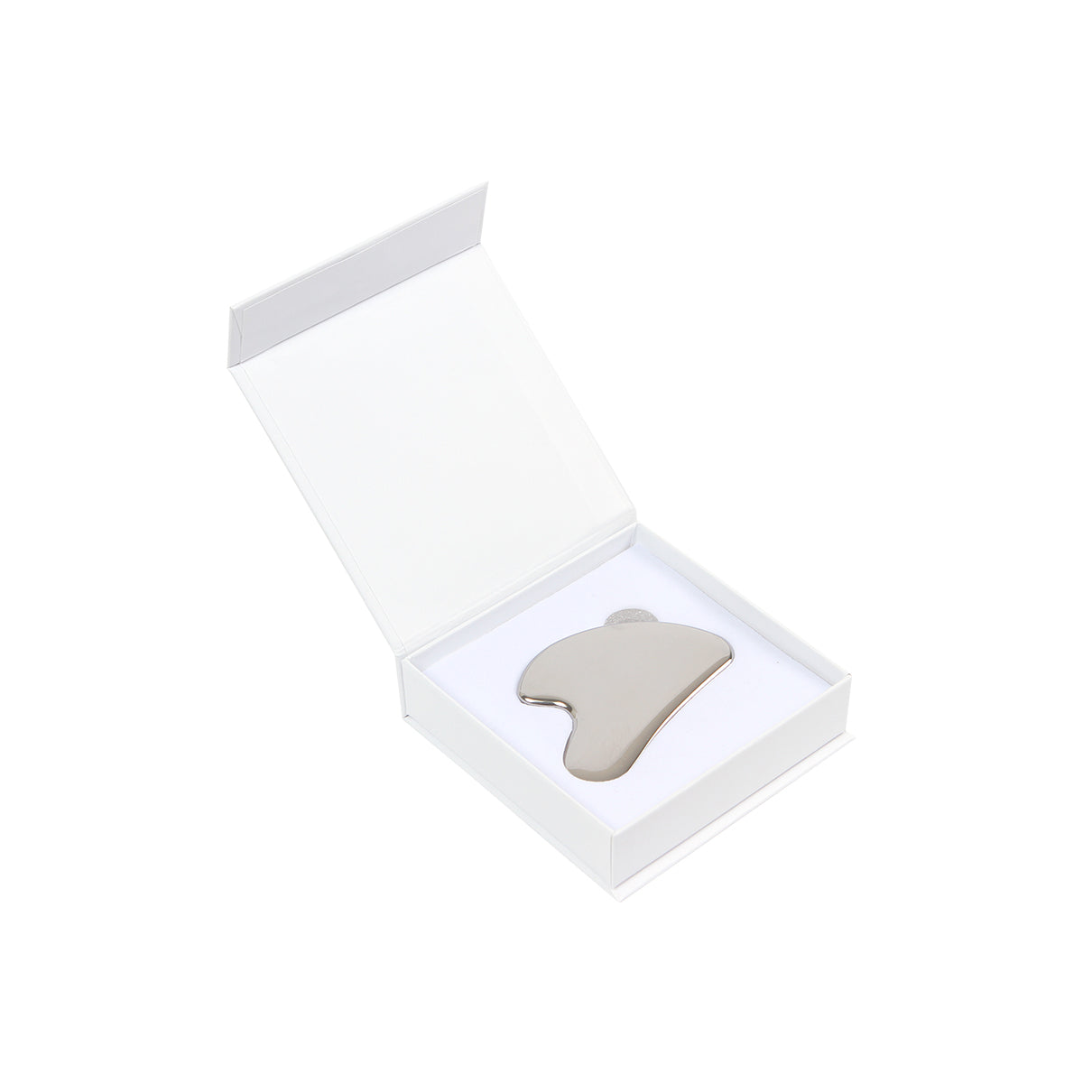 masajeador para el rostro fabricado en acero inoxidable, incluye una caja de cartón para regalo color blanca suajado a la forma del producto. este masajeador te ofrece una oportunidad única de cuidar de tu piel de una manera lujosa y relajante. es perfecto para aquellos que buscan una rutina de cuidado facial efectiva, holística y elegante.