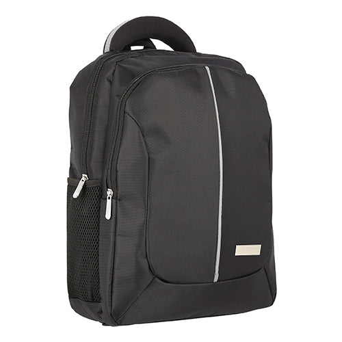 mochila de 2 compartimientos, espacio para laptop max. de 15 pulgadas. asa y 2 bolsas laterales de malla. respaldo, tirantes acojinados y placa metálica.