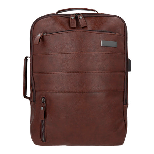 mochila de curpiel con interior de poliéster, placa metálica y 3 compartimentos, asa, bolsa principal con cierre, compartimento inferior con cierre, compartimento trasero con cierre, entrada lateral para batería portátil y audífonos (incluye cables), compartimento para laptop max. de 16 pulgadas, correas ajustables y asa extra que puedes utilizar para convertir la mochila en portafolio.