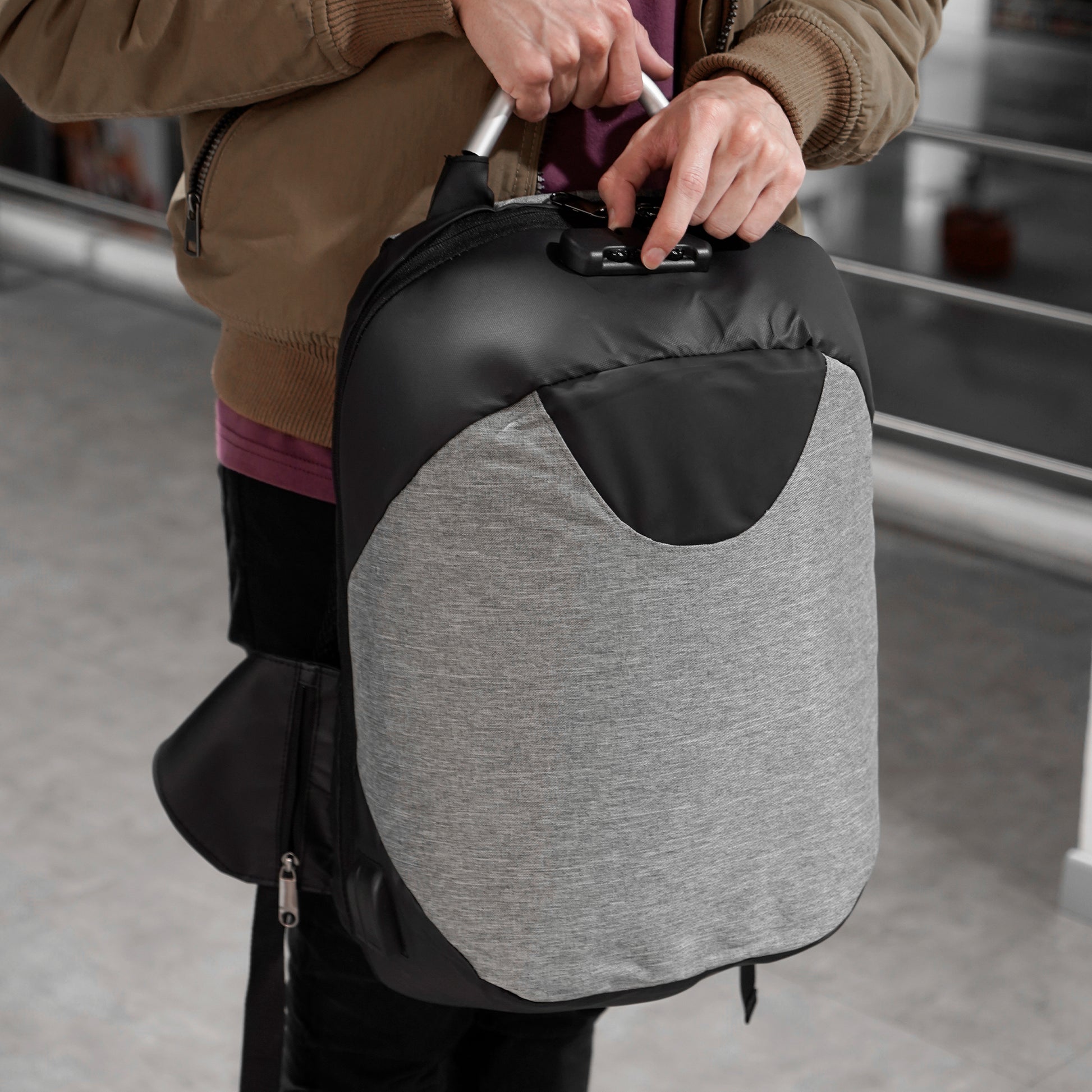 mochila de poliéster con candado de seguridad, asa de aluminio, 1 compartimento para tarjetas, 2 compartimentos laterales, 2 cintillas adaptables para maleta, compartimento para laptop max. de 16 pulgadas, entrada interna con puerto de carga usb, organizador interno de 8 compartimentos respaldo y tirantes acojinados.
