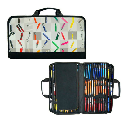 estuche de poliéster con asas, 6 compartimentos, 3 ventanas protectoras y 3 cierres. con espacio para 216 bolígrafos. incluye 202 boligrafos.