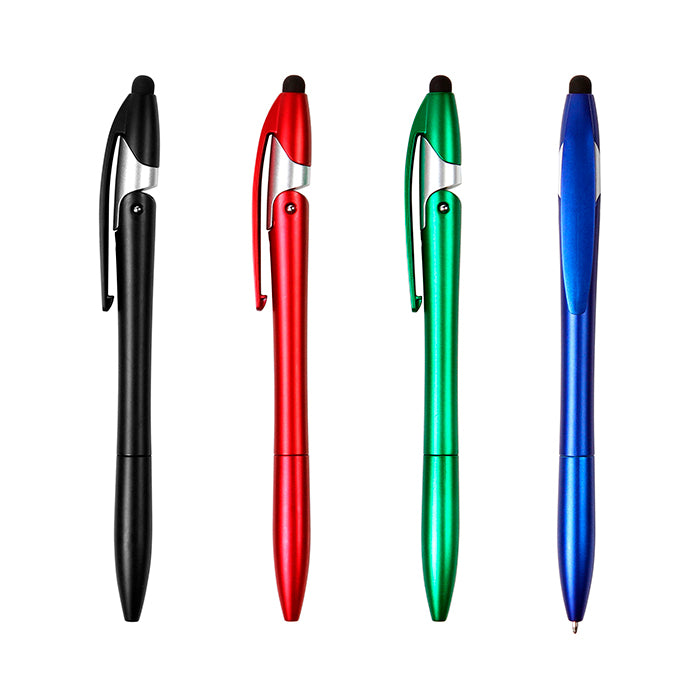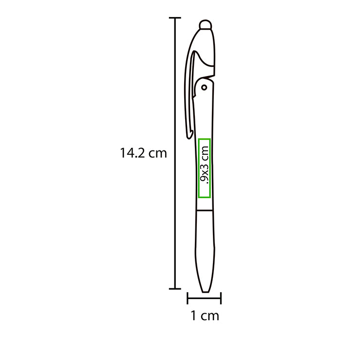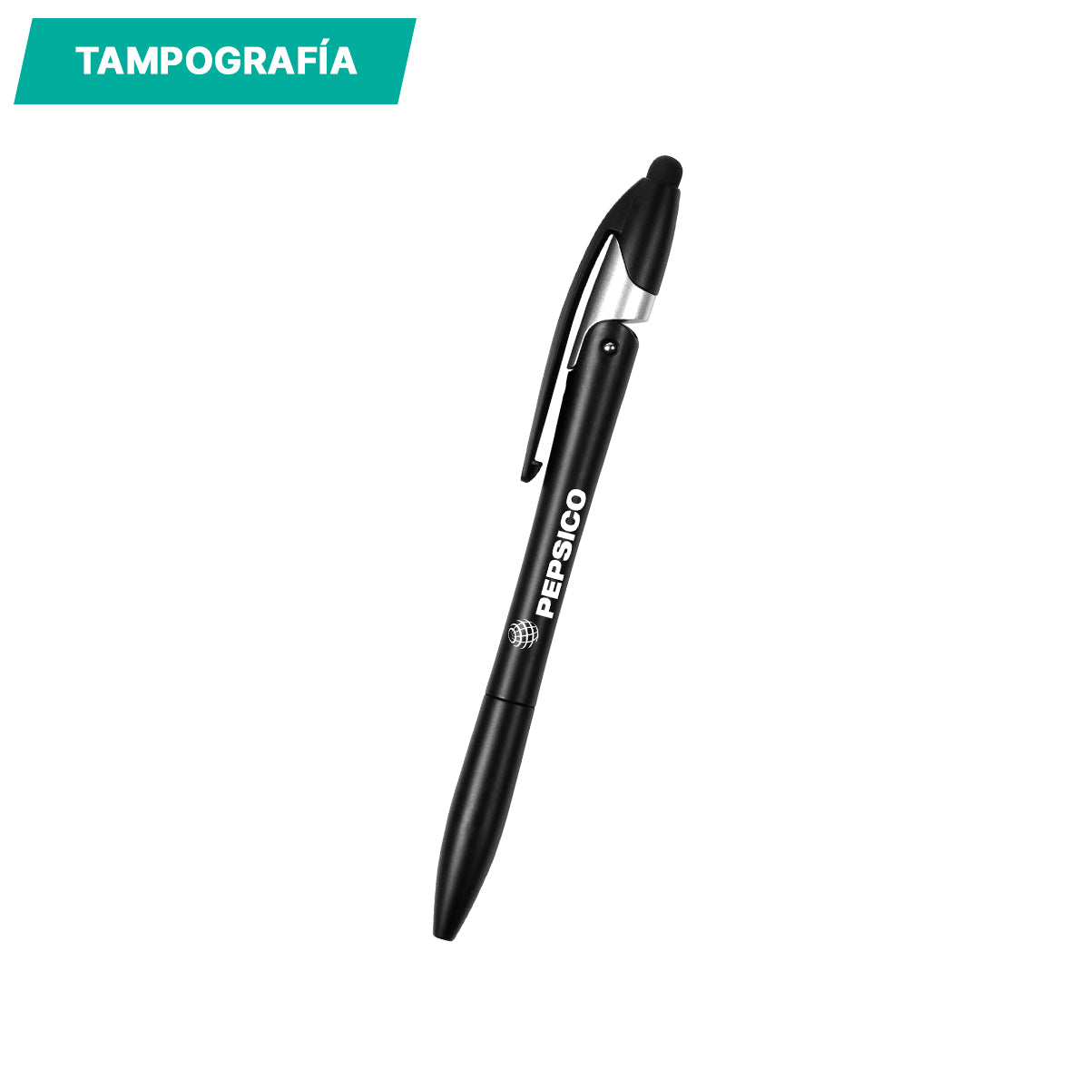 bolígrafo de plástico con puntero touch y diseño superior que funciona como base para celular, tinta de escritura negra.