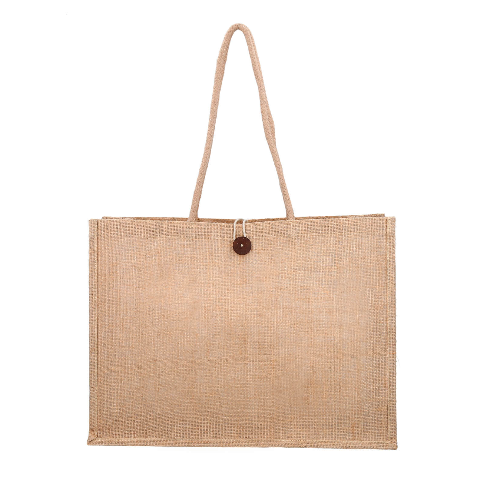 bolsa de yute con interior laminado. cuenta con un par de asas y un botón para cierre.