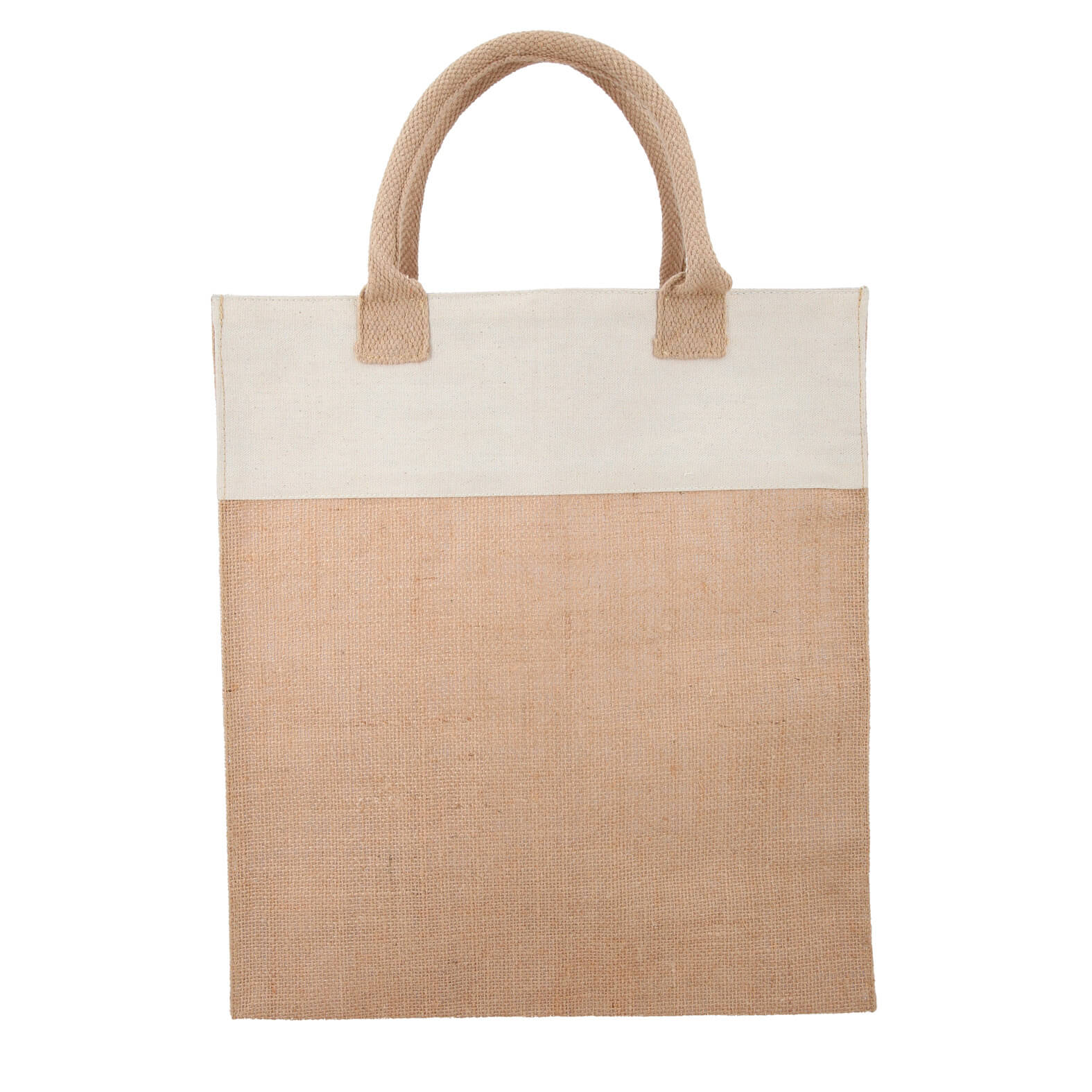 bolsa de yute y algodón con interior plastificado con asas y fuelle.