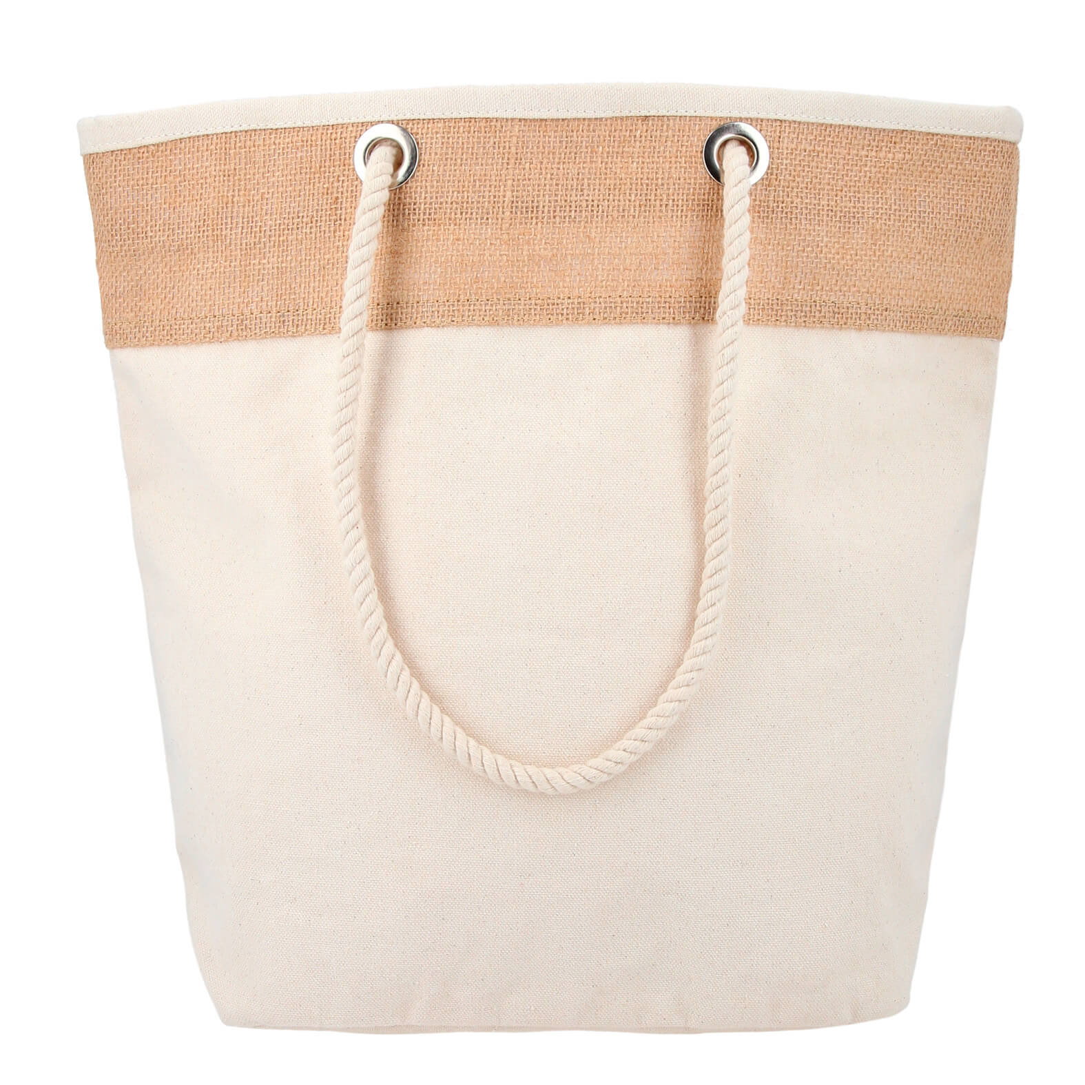 bolsa de yute y algodón con arillos metálicos, asas y fuelle.