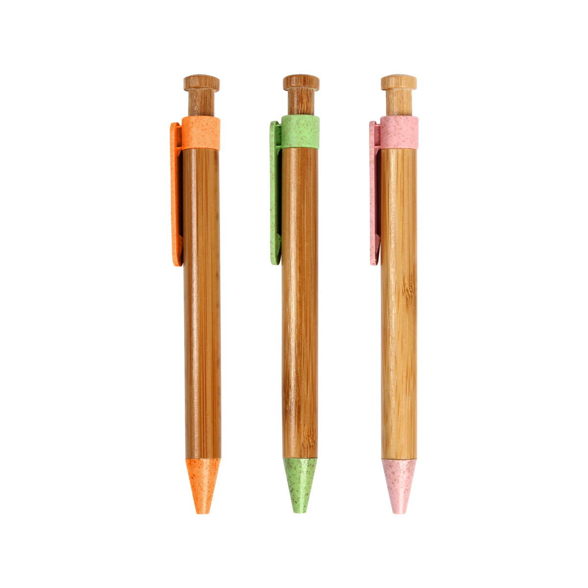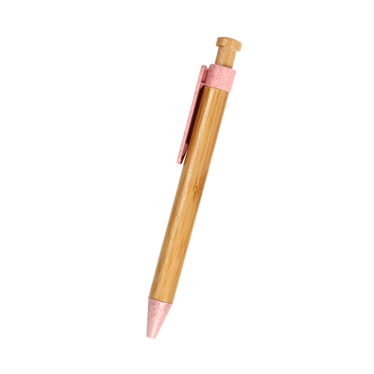 bolígrafo de bambú con diseño eco-amigable. el cuerpo del bolígrafo está hecho de bambú, un material naturalmente renovable y respetuoso con el medio ambiente. tanto la punta como el clip del bolígrafo están fabricados con plástico reciclado y de color. utiliza tinta de escritura negra.