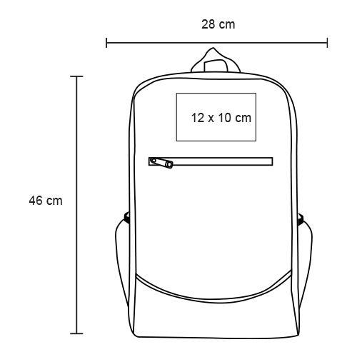 mochila con compartimento principal acolchonado, base reforzada con curpiel, pequeño compartimento frontal, dos mallas laterales, dos correas ajustables, asa superior y fuelle.