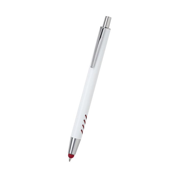 bolígrafo retráctil con barril de aluminio blanco, botón cromado, puntero touch y detalles de color en el barril, tinta de escritura negra.