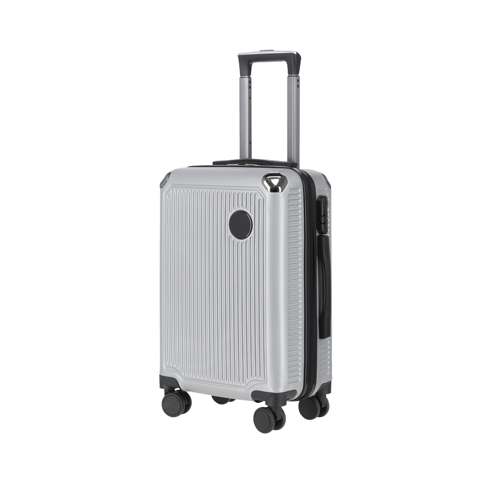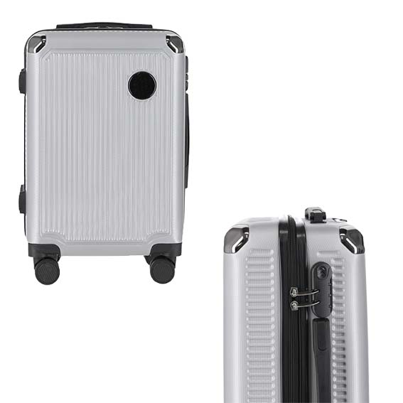 maleta de plástico para viaje, con doble rueda giratoria, asa metálica retráctil y candado de seguridad.