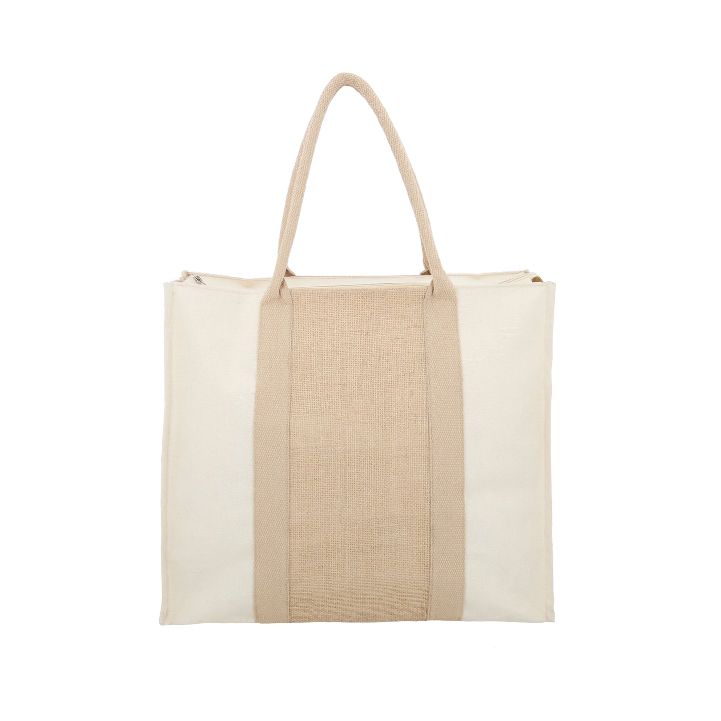 bolsa de yute con loneta, interior laminado con asas, fuelle y cierre.