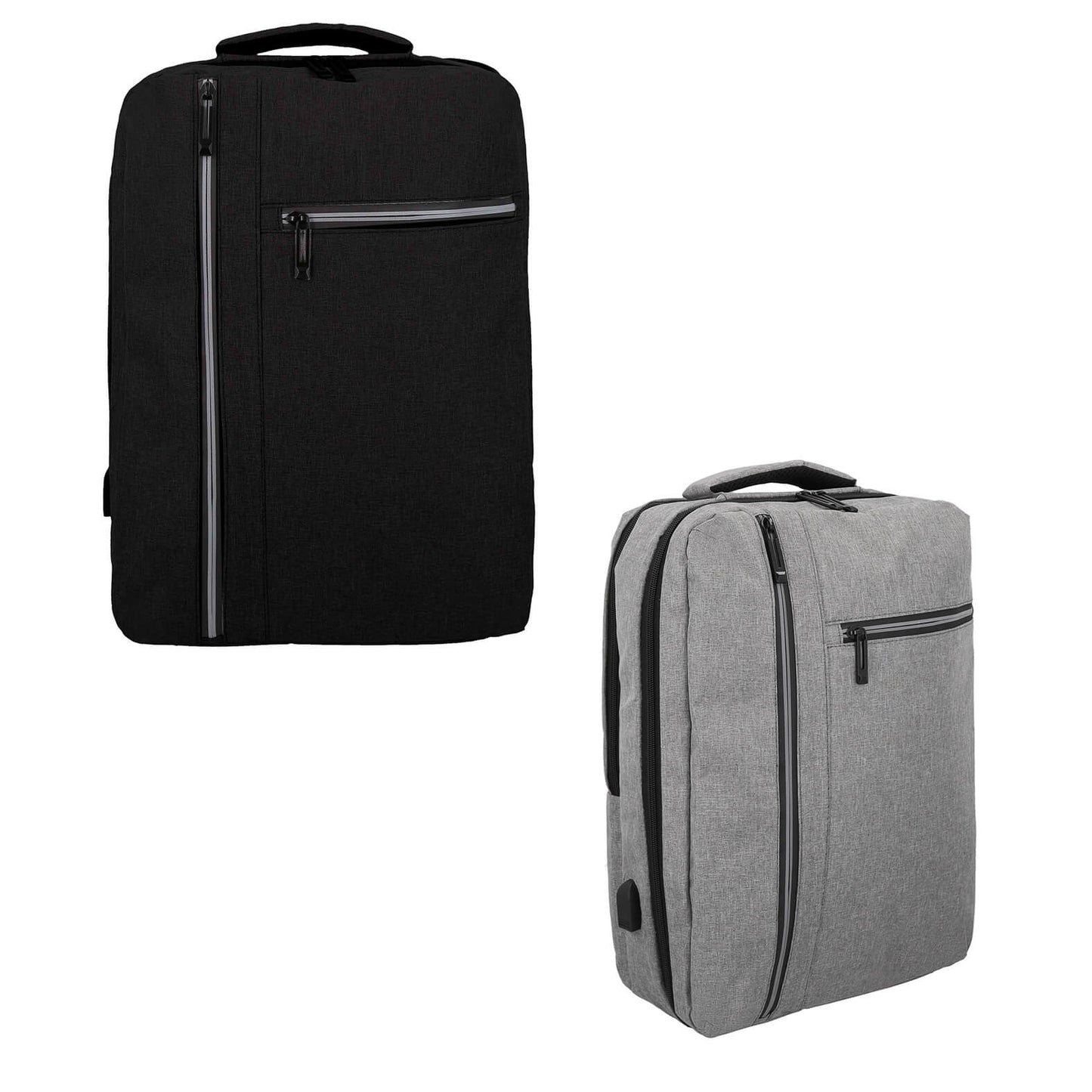 mochila funcional con compartimento de seguridad, porta laptop de 17", compartimento secundario con resortes para ropa, malla, cierre interior, 2 bolsas frontales y puerto para carga usb.