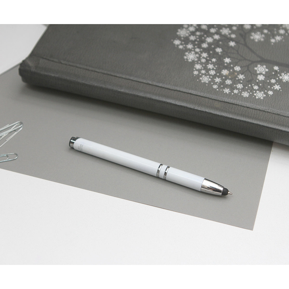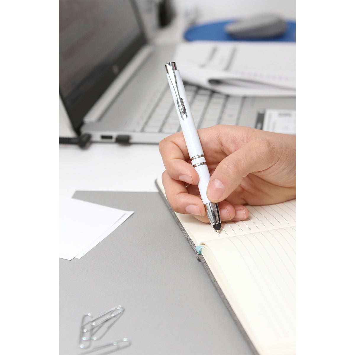 bolígrafo fabricado en plástico abs con material antibacterial (iones de plata). tinta negra. el material antibacterial con certificación iso 22196 inhibe hasta en un 99.9% el crecimiento y multiplicación de bacterias. el aditivo tiene como base los iones de plata, tecnología que ha sido reconocida y utilizada durante siglos y que no tiene efectos dañinos.