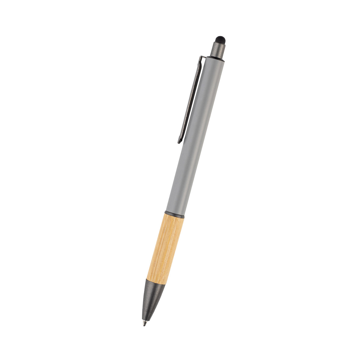 bolígrafo con barril de aluminio y detalle de bambú en la parte inferior, clip y punta metálicos, con touch en la parte superior. tinta de gel escritura azul.